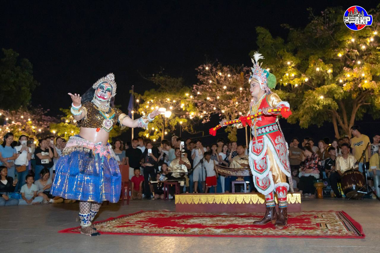 AKP Phnom Penh, March 01, 2025– Pedestrians are enjoying the performances of Lakhon Bassac, a form of Khmer traditional opera theatre, and Chapei Dang Veng, Cambodian two-stringed, long-necked guitar, on Walk Street this evening. Photo: Serey Oddom
