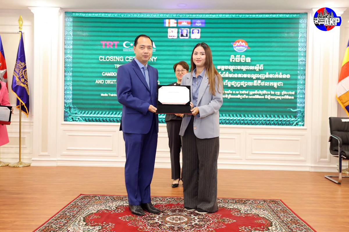 AKP Phnom Penh, February 21, 2025— Minister of Information H.E. Neth Pheaktra (L, Pic. 1) hands over a certificate to trainees at the closing ceremony of the five-day Training on Cambodia Social Media and Digital Media Reporting, held at the ministry this morning. P...