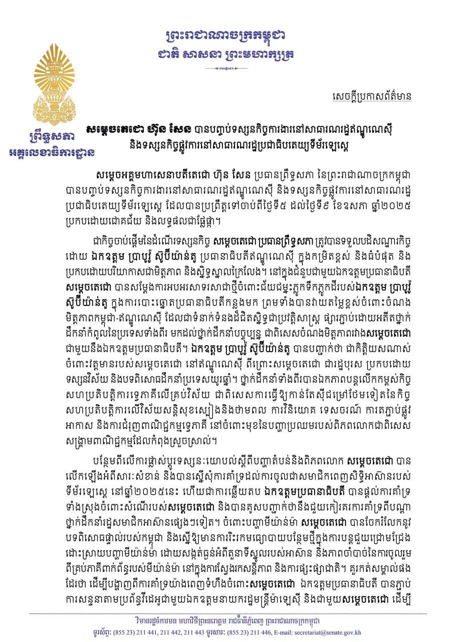 លទ្ធផលដំណើរទស្សនកិច្ចការងារ និងទស្សនកិច្ចផ្លូវការរបស់ សម្តេចតេជោ ហ៊ុន សែន នៅឥណ្ឌូនេស៊ី និងទីម័រឡេស្តេ