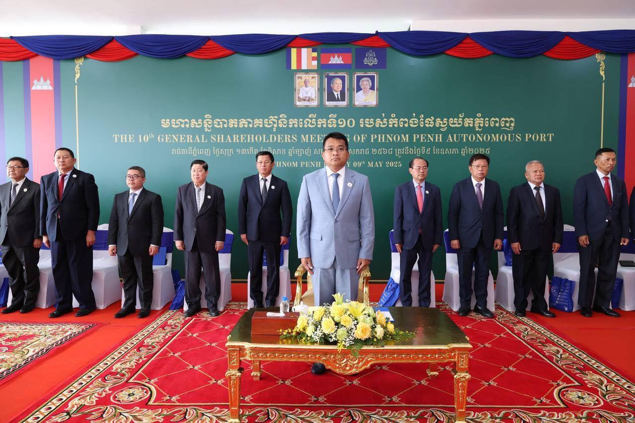 AKP ភ្នំពេញ ថ្ងៃទី០៩ ខែ ឧសភា ឆ្នាំ២០២៥-- ឯកឧត្តម ប៉េង ពោធិ៍នា រដ្ឋមន្រ្តីក្រសួងសាធារណការ និងដឹកជញ្ជូន បានអញ្ជើញជាអធិបតីក្នុងមហាសន្និបាតភាគហ៊ុនិកលើកទី១០ របស់កំពង់ផែស្វយ័តភ្នំពេញ នាព្រឹកថ្ងៃសុក្រ ទី០៩ ខែឧសភា ឆ្នាំ២០២៥ ដោយមានការចូលរួមពីឯកឧត្តម ហ៊ឺ បាវី ប្រតិភូរាជរដ្ឋាភិបាលកម្ពុជាទទួលបន្ទុកជាប្រធានអគ...