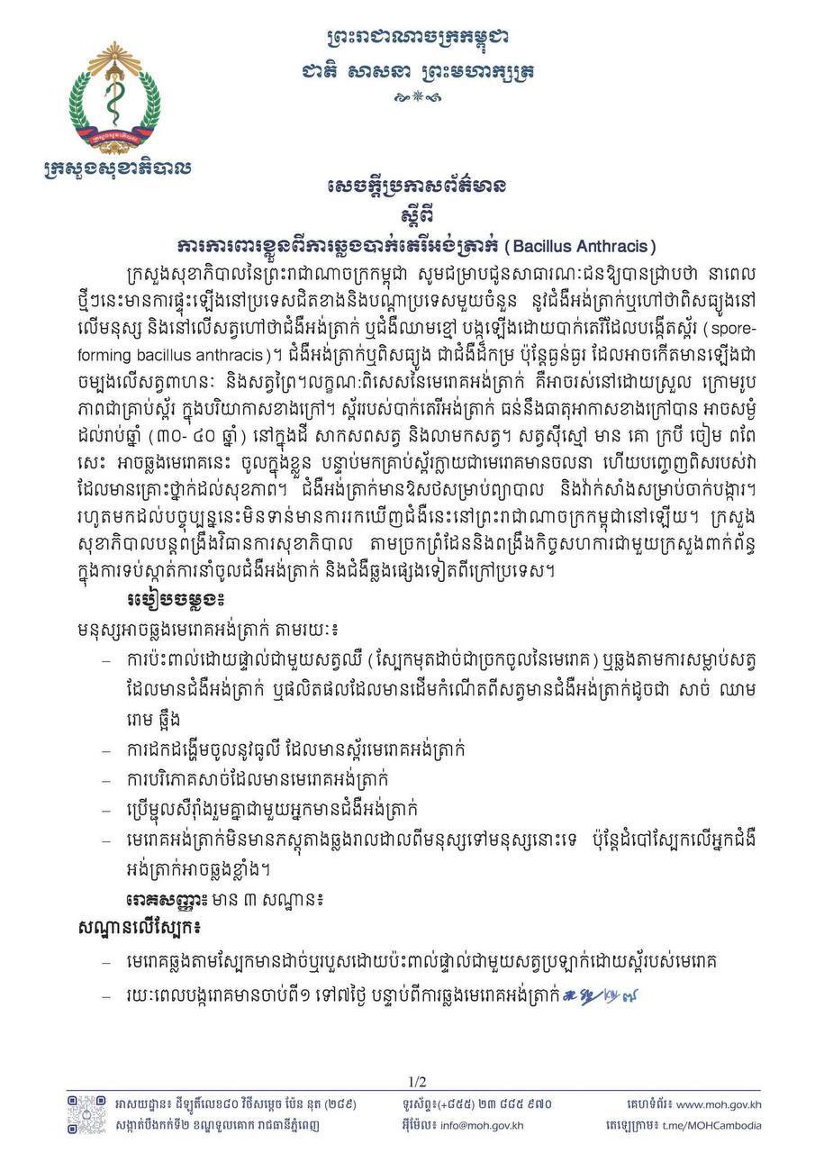 សេចក្តីប្រកាសព័ត៌មាន ស្តីពីការការពារខ្លួនពីការឆ្លងបាក់តេរីអង់ត្រាក់ (Bacillus Anthracis)