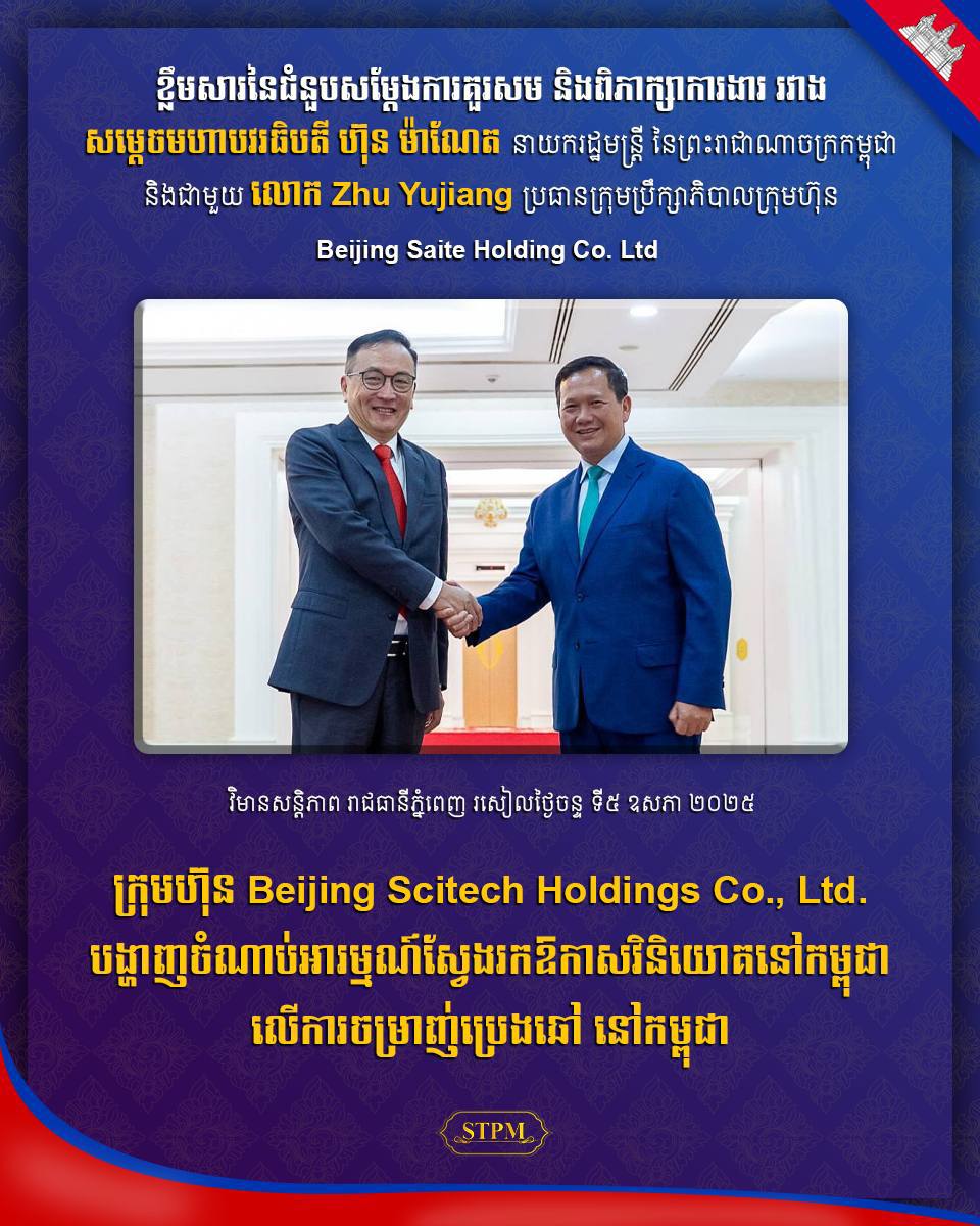 AKP ភ្នំពេញ ថ្ងៃទី០៥ ខែឧសភា ឆ្នាំ២០២៥ – សម្តេចមហាបវរធិបតី ហ៊ុន ម៉ាណែត នាយករដ្ឋមន្ត្រីនៃព្រះរាជាណាចក្រកម្ពុជា នារសៀលថ្ងៃទី០៥ ខែឧសភា ឆ្នាំ២០២៥នេះ បានអនុញ្ញាតឱ្យ លោក Zhu Yujiang ប្រធានក្រុមប្រឹក្សាភិបាល នៃក្រុមហ៊ុន Beijing Scitech Holdings Co., Ltd. ចូលជួបសម្តែងការគួរសម និងពិភាក្សាការងារ នៅវិមានសន្តិភា...