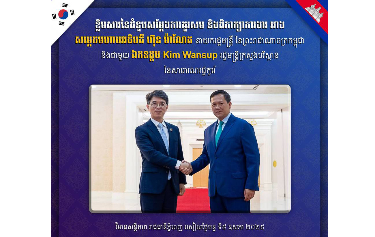 AKP ភ្នំពេញ ថ្ងៃទី០៥ ខែឧសភា ឆ្នាំ២០២៥–សម្តេចមហាបវរធិបតី ហ៊ុន ម៉ាណែត នាយករដ្ឋមន្ត្រីនៃព្រះរាជាណាចក្រកម្ពុជា នារសៀលថ្ងៃទី០៥ ខែឧសភា ឆ្នាំ២០២៥នេះ បានអនុញ្ញាតឱ្យឯកឧត្តម Kim Wansup រដ្ឋមន្ត្រីក្រសួងបរិស្ថាន នៃសាធារណរដ្ឋកូរ៉េ ចូលជួបសម្តែងការគួរសម និងពិភាក្សាការងារ នៅវិមានសន្តិភាព។ ក្នុងឱកាសជំនួបនេ...