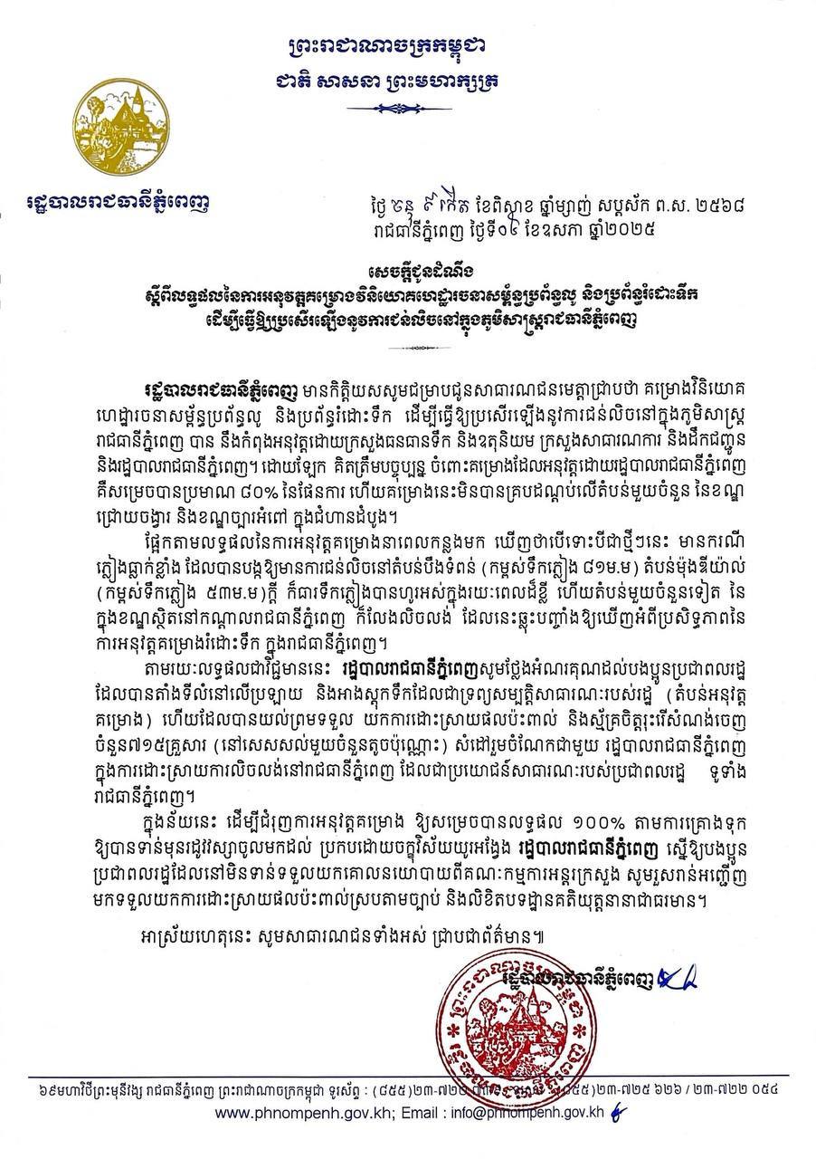 រដ្ឋបាលរាជធានីភ្នំពេញជូនដំណឹងស្តីពីលទ្ធផលនៃការអនុវត្តគម្រោងវិនិយោគហេដ្ឋារចនាសម្ព័ន្ធប្រព័ន្ធលូ និងប្រព័ន្ធរំដោះទឹកនៅរាជធានី