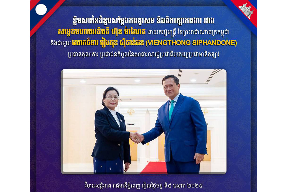AKP ភ្នំពេញ ថ្ងៃទី០៥ ខែឧសភា ឆ្នាំ២០២៥–សម្តេចមហាបវរធិបតី ហ៊ុន ម៉ាណែត នាយករដ្ឋមន្ត្រីនៃព្រះរាជាណាចក្រកម្ពុជា នារសៀលថ្ងៃទី៥ ខែឧសភា ឆ្នាំ២០២៥នេះ បានអនុញ្ញាតឱ្យលោកជំទាវ វៀងថុន ស៊ីផាន់ដន (Viengthong Siphandone) ប្រធានតុលាការប្រជាជនកំពូលនៃសាធារណរដ្ឋប្រជាធិបតេយ្យប្រជាមានិតឡាវ ចូលជួបសម្តែងការគួរសម និងពិភាក្ស...