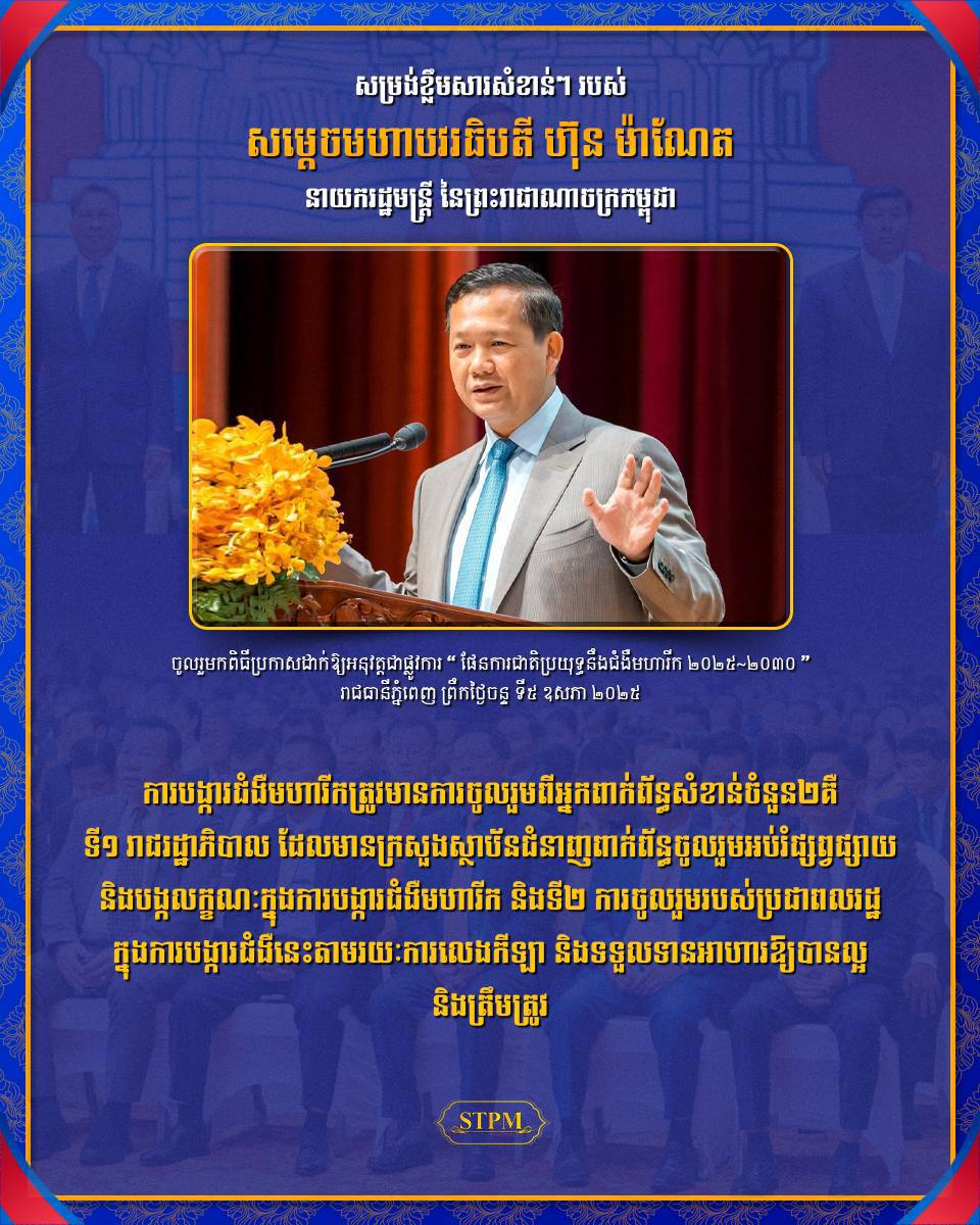 AKP ភ្នំពេញ ថ្ងៃទី០៥ ខែឧសភា ឆ្នាំ២០២៥ – សម្ដេចមហាបវរធិបតី ហ៊ុន ម៉ាណែត នាយករដ្ឋមន្ត្រី នៃព្រះរាជាណាចក្រកម្ពុជា បានថ្លែងក្នុងពិធីប្រកាសដាក់ឱ្យអនុវត្តជាផ្លូវការ “ផែនការជាតិប្រយុទ្ធនឹងជំងឺមហារីក ឆ្នាំ២០២៥-២០៣០ នាព្រឹកថ្ងៃទី៥ ខែឧសភា ឆ្នាំ២០២៥ ថា៖ ការបង្ការជំងឺមហារីកត្រូវមានការចូលរួមពីអ្នកពាក់ព័ន្ធសំខាន់ច...