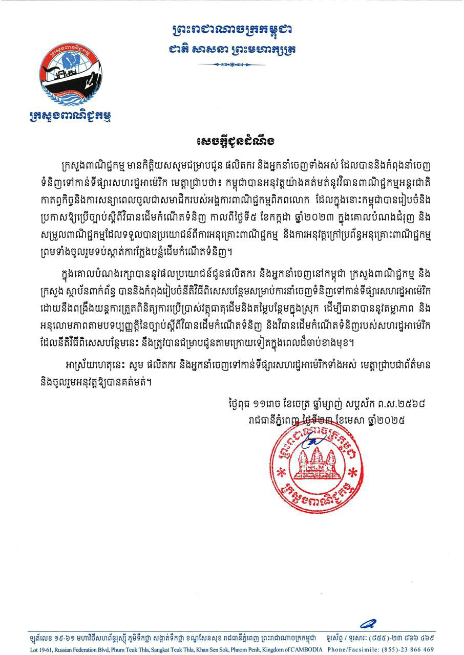 សេចក្តីជូនដំណឹង ស្តីពី កម្ពុជាបាននិងកំពុងរៀបចំនីតិវិធីពិសេសបន្ថែមសម្រាប់ការនាំចេញទំនិញទៅកាន់ទីផ្សារសហរដ្ឋអាម៉េរិក