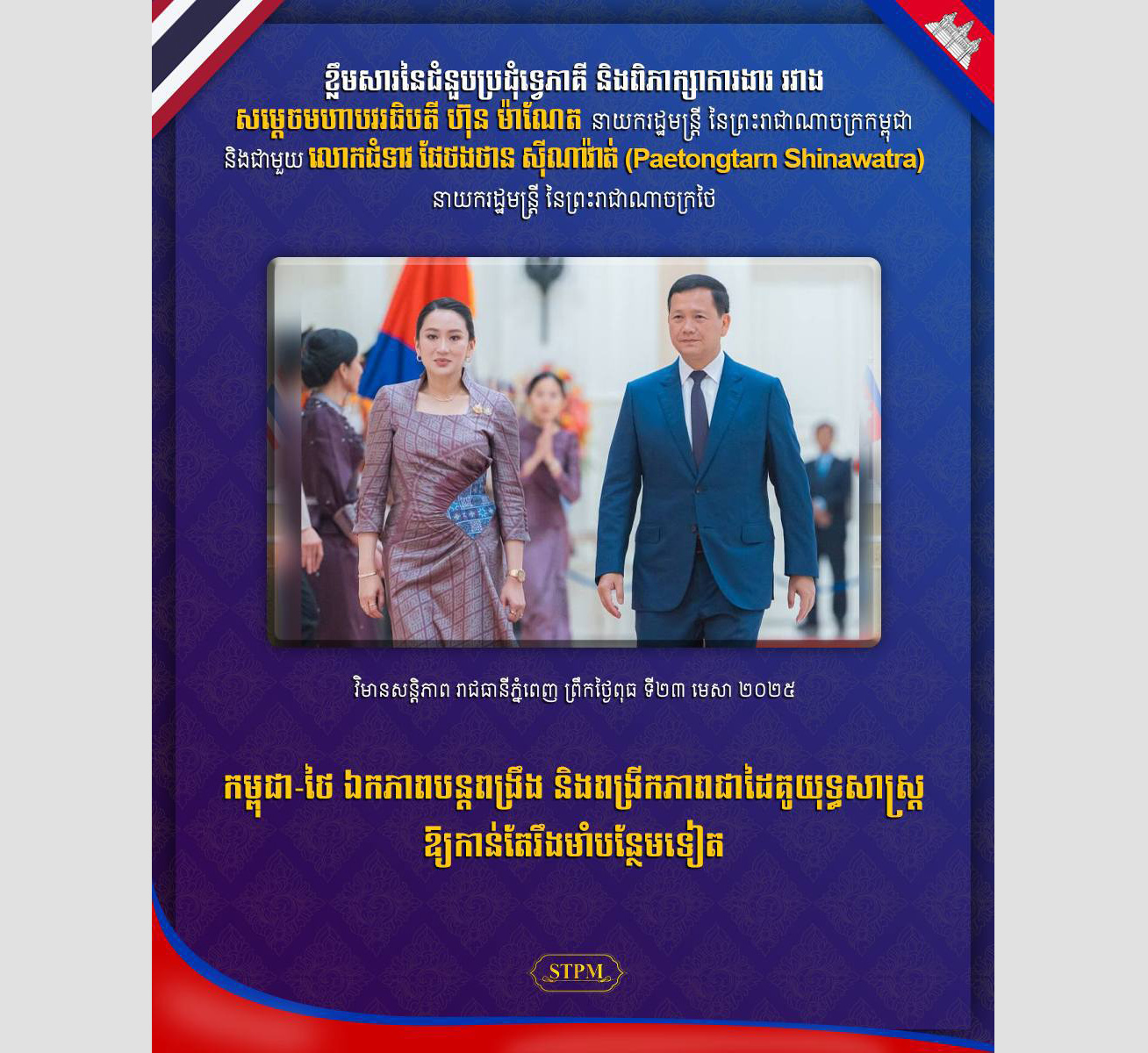 AKP ភ្នំពេញ ថ្ងៃទី២៣ ខែមេសា ឆ្នាំ២០២៥– សម្តេចមហាបវរធិបតី ហ៊ុន ម៉ាណែត នាយករដ្ឋមន្រ្តី នៃព្រះរាជាណាចក្រកម្ពុជា នាព្រឹកថ្ងៃទី២៣ ខែមេសា ឆ្នាំ២០២៥នេះ បានជួបពិភាក្សាការងារទ្វេភាគី ជាមួយ លោកជំទាវ ផែថងថាន ស៊ីណាវ៉ាត់ (Paetongtarn Shinawatra) នាយករដ្ឋមន្ត្រី នៃព្រះរាជាណាចក្រថៃ និងគណៈប្រតិភូជាន់ខ្ពស់ ក្នុងដ...