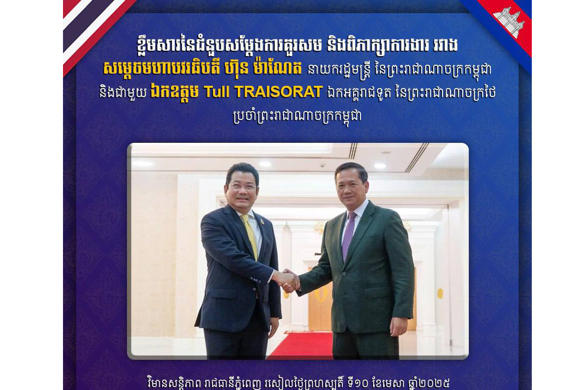 AKP ភ្នំពេញ ថ្ងៃទី១០ ខែមេសា ឆ្នាំ២០២៥–សម្ដេចមហាបវរធិបតី ហ៊ុន ម៉ាណែត នាយករដ្ឋមន្ត្រីនៃព្រះរាជាណាចក្រកម្ពុជា នារសៀលថ្ងៃទី១០ ខែមេសា ឆ្នាំ២០២៥នេះ បានទទួលជួបសម្តែងការគួរសម និងពិភាក្សាការងារជាមួយ ឯកឧត្តម Tull TRAISORAT ឯកអគ្គរាជទូតព្រះរាជាណាចក្រថៃថ្មីប្រចាំព្រះរាជាណាចក្រកម្ពុជា នៅវិមានសន្តិភាព។ ន...