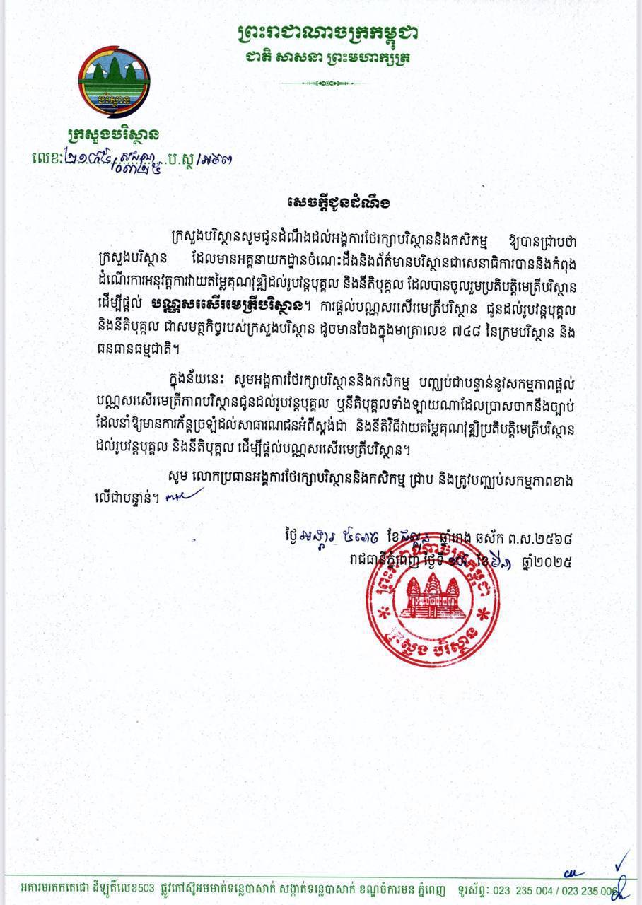 អ្នកនាំពាក្យ៖ សកម្មភាពផ្តល់បណ្ណសរសើរមេត្រីបរិស្ថានជូនរូបវន្តបុគ្គលឬនីតិបុគ្គល ដោយអង្គការថែរក្សាបរិស្ថាននិងកសិកម្ម គឺជាសកម្មភាពល្មើសទៅនឹងច្បាប់, ម្ចាស់ក្រុមហ៊ុន សហគ្រាសទាំងអស់ សូមប្រុងប្រយ័ត្នចំពោះការបោកប្រាស់ ន...