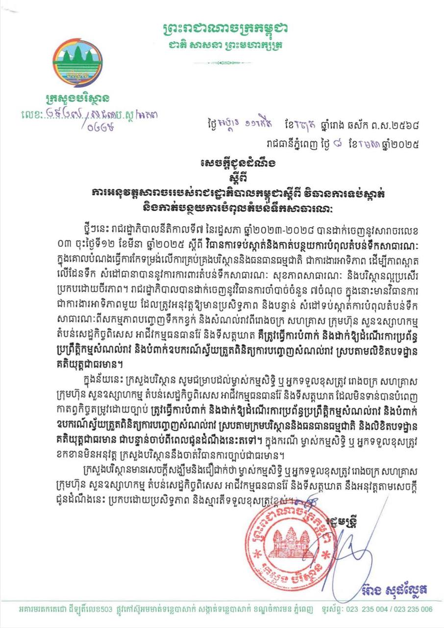 AKP ភ្នំពេញ ថ្ងៃទី០៨ ខែមេសា ឆ្នាំ២០២៥-- ក្រសួងបរិស្ថានបានចេញមកព្រមានដល់ជនទាំងឡាយណាដែលបំពុលប្រភពទឹកសាធារណៈ។ ការព្រមាននេះធ្វើឡើងបន្ទាប់ពីមានក្រុមហ៊ុន រោងចក្រ សហគ្រាសមួយចំនួនបានបំពុលទឹកស្អាតបង្កប៉ះពាល់ដល់អ្នកប្រើប្រាសទឹករួចមក។ បើយោងតាមសេចក្តីជូនដំណឹងរបស់ក្រសួងបរិសា្ថននៅថ្ងៃទី០៨ ខែមេសា ឆ្នាំ២០២៥នេះ ប...