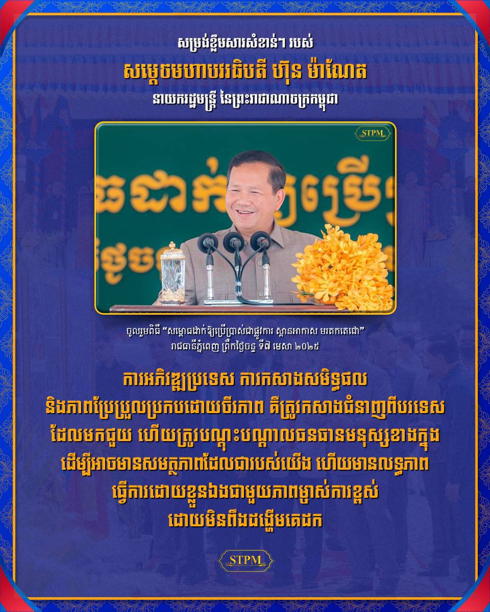 AKP ភ្នំពេញ ថ្ងៃទី០៧ ខែមេសា ឆ្នាំ២០២៥ – សម្តេចមហាបវរធិបតី ហ៊ុន ម៉ាណែត នាយករដ្ឋមន្ត្រីនៃព្រះរាជាណាចក្រកម្ពុជា បានថ្លែងក្នុងពិធី “សម្ពោធដាក់ឱ្យប្រើប្រាស់ជាផ្លូវការស្ពានអាកាសមរតកតេជោ” នាព្រឹកថ្ងៃចន្ទ ទី៧ ខែមេសា ឆ្នាំ២០២៥ ថា ការអភិវឌ្ឍប្រទេស ការកសាងសមិទ្ធផល និងភាពប្រែប្រួលប្រកបដោយចីរភាព គឺត្រូវកសាងជំនា...