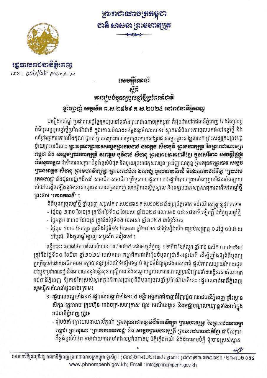 AKP ភ្នំពេញ ថ្ងៃទី០២ ខែមេសា ឆ្នាំ២០២៥-- រដ្ឋបាលរាជធានីភ្នំពេញបានចេញសេចក្ដីជូនដំណឹងទៅអាជ្ញាធរខណ្ឌ សង្កាត់ មន្ទីរ ក្រុមហ៊ុន សហគ្រាស អាជីវកម្មគ្រប់ប្រភេទ គេហដ្ឋាន ត្រូវរៀបចំតុងតែងលម្អ សោភ័ណភាពឱ្យបានស្អាត ដើម្បីទទួលទេវតាឆ្នាំថ្មីប្រពៃណីជាតិខ្មែរ នៅរាជធានីភ្នំពេញ។ ជារៀងរាល់ឆ្នាំ ប្រជាពលរដ្ឋខ្មែរគ្រប់រ...