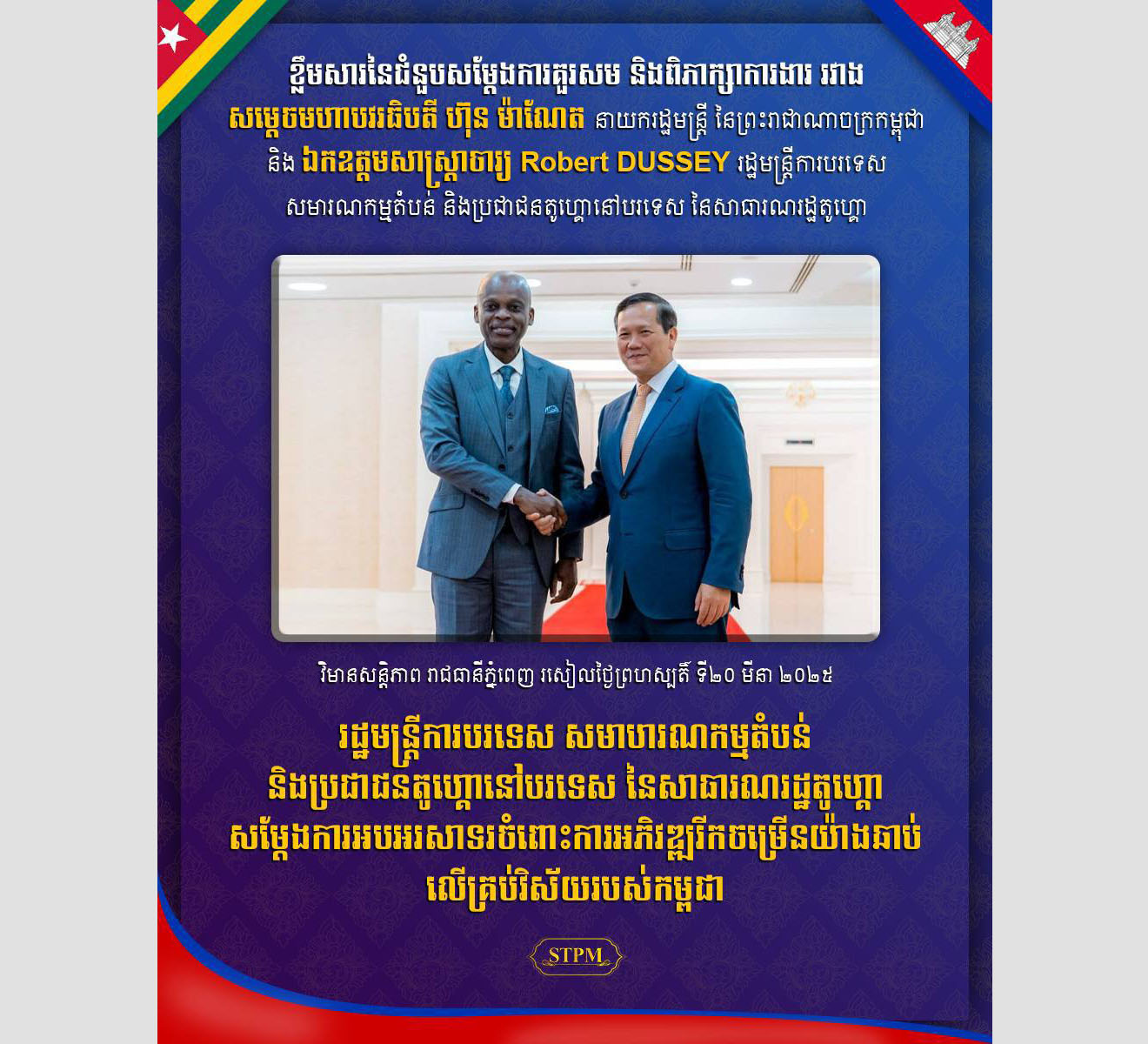 AKP ភ្នំពេញ ថ្ងៃទី២០ ខែមីនា ឆ្នាំ២០២៥– សម្ដេចមហាបវរធិបតី ហ៊ុន ម៉ាណែត នាយករដ្ឋមន្ត្រីនៃព្រះរាជាណាចក្រកម្ពុជា នារសៀលថ្ងៃទី២០ ខែមីនា ឆ្នាំ២០២៥នេះ បានអនុញ្ញាតឱ្យ ឯកឧត្តមសាស្ត្រាចារ្យ Robert DUSSEY រដ្ឋមន្ត្រីការបរទេស សមារណកម្មតំបន់ និងប្រជាជនតូហ្គោនៅបរទេស នៃសាធារណរដ្ឋតូហ្គោ និងគណៈប្រតិភូ ចូលជួបសម្តែង...