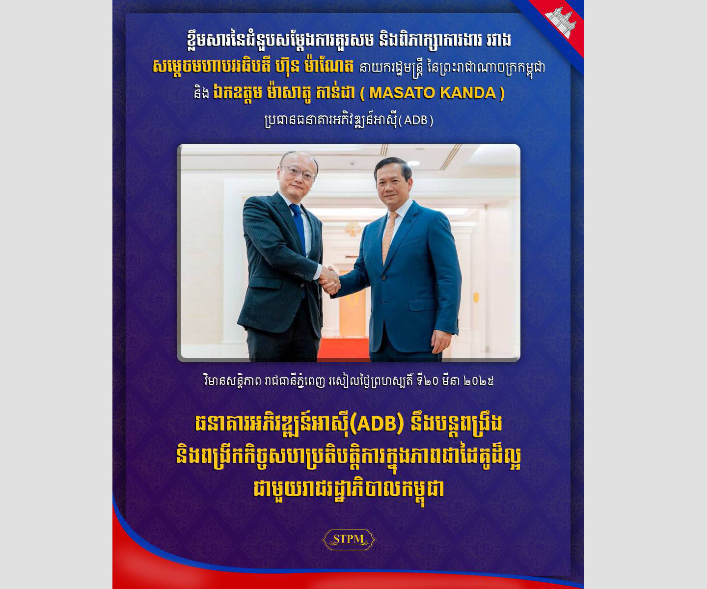 AKP ភ្នំពេញ ថ្ងៃទី២០ ខែមីនា ឆ្នាំ២០២៥– សម្ដេចមហាបវរធិបតី ហ៊ុន ម៉ាណែត នាយករដ្ឋមន្ត្រីនៃព្រះរាជាណាចក្រកម្ពុជា នារសៀលថ្ងៃទី២០ ខែមីនា ឆ្នាំ២០២៥នេះ បានអនុញ្ញាតឱ្យ ឯកឧត្តម ម៉ាសាតូ កាន់ដា (MASATO KANDA) ប្រធានធនាគារអភិវឌ្ឍន៍អាស៊ី (ADB) ចូលជួបសម្តែងការគួរសម និងពិភាក្សាការងារ នៅវិមានសន្ដិភាព។ ក្នុង...