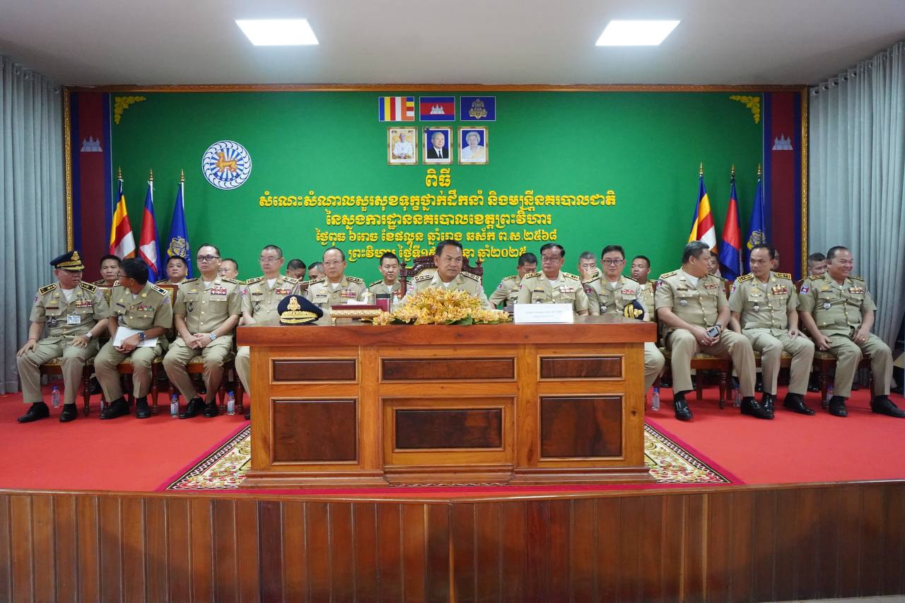 AKP ព្រះវិហារ ថ្ងៃទី២០ ខែមីនា ឆ្នាំ២០២៥-- ឯកឧត្តម នាយឧត្តមសេនីយ៍ ស ថេត អគ្គស្នងការនគរបាលជាតិ បានដឹកនាំប្រតិភូអគ្គស្នងការដ្ឋាននគរបាលជាតិចុះជួបសំណេះសំណាល និងសួរសុខទុក្ខកងកម្លាំងនគរបាលការពារព្រំដែនប្រចាំទិសភូមិភាគទី៤ កាលពីថ្ងៃទី១៩ ខែមីនា ឆ្នាំ២០២៥ ស្ថិតនៅឃុំស្រអែម ស្រុមជាំក្សាន្ត ខេត្តព្រះវិហារ នាឱក...