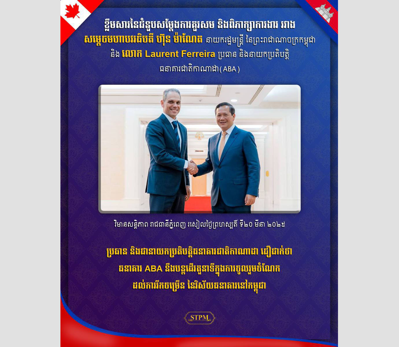 AKP ភ្នំពេញ ថ្ងៃទី២០ ខែមីនា ឆ្នាំ២០២៥– សម្ដេចមហាបវរធិបតី ហ៊ុន ម៉ាណែត នាយករដ្ឋមន្ត្រីនៃព្រះរាជាណាចក្រកម្ពុជា នារសៀលថ្ងៃទី២០ ខែមីនា ឆ្នាំ២០២៥នេះ បានអនុញ្ញាតឱ្យ លោក Laurent Ferreira ប្រធាន និងនាយកប្រតិបត្តិធនាគារជាតិកាណាដា និងជាភាគហ៊ុនិករបស់ធនាគារ ABA និងគណៈប្រតិភូ ចូលជួបសម្តែងការគួរសម និងពិភាក្ស...