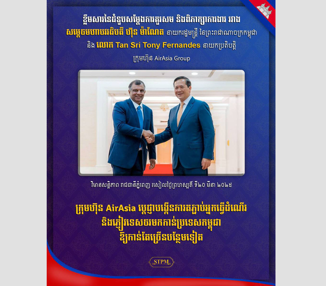 AKP ភ្នំពេញ ថ្ងៃទី២០ ខែមីនា ឆ្នាំ២០២៥– សម្ដេចមហាបវរធិបតី ហ៊ុន ម៉ាណែត នាយករដ្ឋមន្ត្រីនៃព្រះរាជាណាចក្រកម្ពុជា នារសៀលថ្ងៃទី២០ ខែមីនា ឆ្នាំ២០២៥នេះ បានអនុញ្ញាតឱ្យ លោក Tan Sri Tony Fernandes នាយកប្រតិបត្តិក្រុមហ៊ុន Capital A Group (AirAsia) ចូលជួបសម្តែងការគួរសម និងពិភាក្សាការងារ នៅវិមានសន្ដិភាព។...