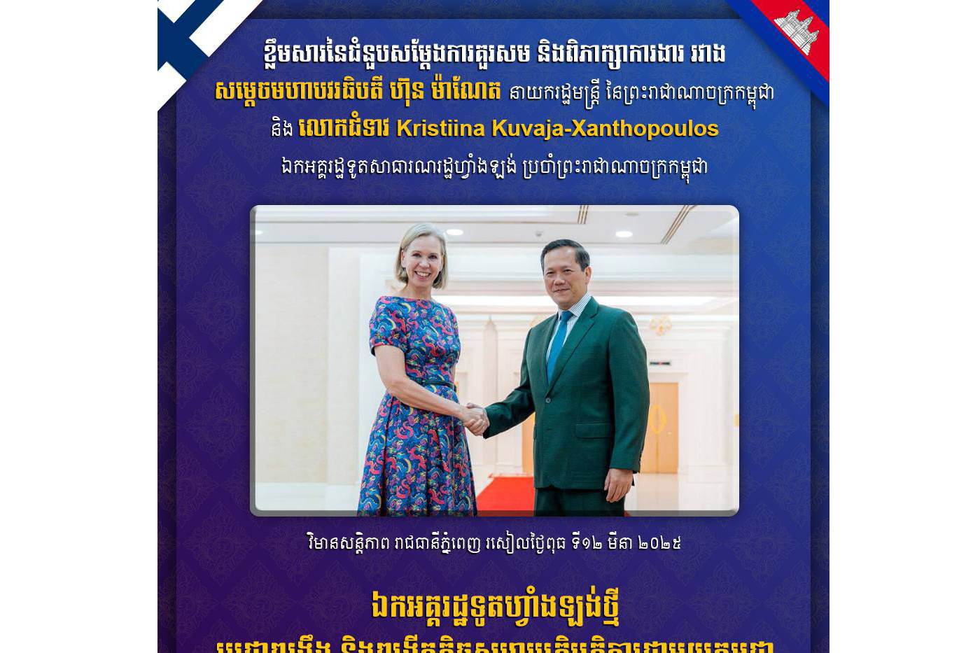 AKP ភ្នំពេញ ថ្ងៃទី១២ ខែមីនា ឆ្នាំ២០២៥–សម្ដេចមហាបវរធិបតី ហ៊ុន ម៉ាណែត នាយករដ្ឋមន្ត្រីនៃព្រះរាជាណាចក្រកម្ពុជា នារសៀលថ្ងៃទី១២ ខែមីនា ឆ្នាំ២០២៥នេះ បានអនុញ្ញាតលោកជំទាវ គ្រីស្ទីណា គូវ៉ាចា សាន់តូពូឡូស ឯកអគ្គរដ្ឋទូតហ្វាំងឡង់ប្រចាំព្រះរាជាណាចក្រកម្ពុជា ដែលមាននិវេសនដ្ឋាននៅទីក្រុងបាងកក ចូលជួបសម្តែងការគួរសម...