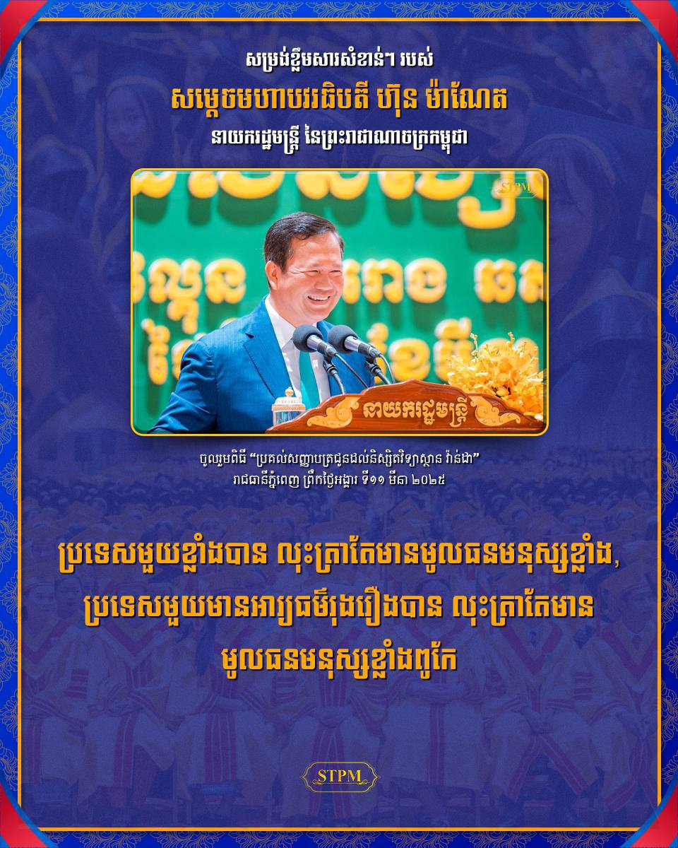 AKP ភ្នំពេញ ថ្ងៃទី១១ ខែមីនា ឆ្នាំ២០២៥–សម្តេចមហាបវរធិបតី ហ៊ុន ម៉ាណែត នាយករដ្ឋមន្ត្រីនៃព្រះរាជាណាចក្រកម្ពុជា បានថ្លែងក្នុងពិធីប្រគល់សញ្ញាបត្រជូនដល់និស្សិតជ័យលាភីចំនួន ៤ ៤២៦នាក់ (នារី ៣ ៩២៤នាក់) កម្រិតបរិញ្ញាបត្ររង បរិញ្ញាបត្រ និងបរិញ្ញាបត្រជាន់ខ្ពស់ នៅវិទ្យាស្ថានវ៉ាន់ដា នាព្រឹកថ្ងៃអង្គារ ថ្ងៃទី១២ ...