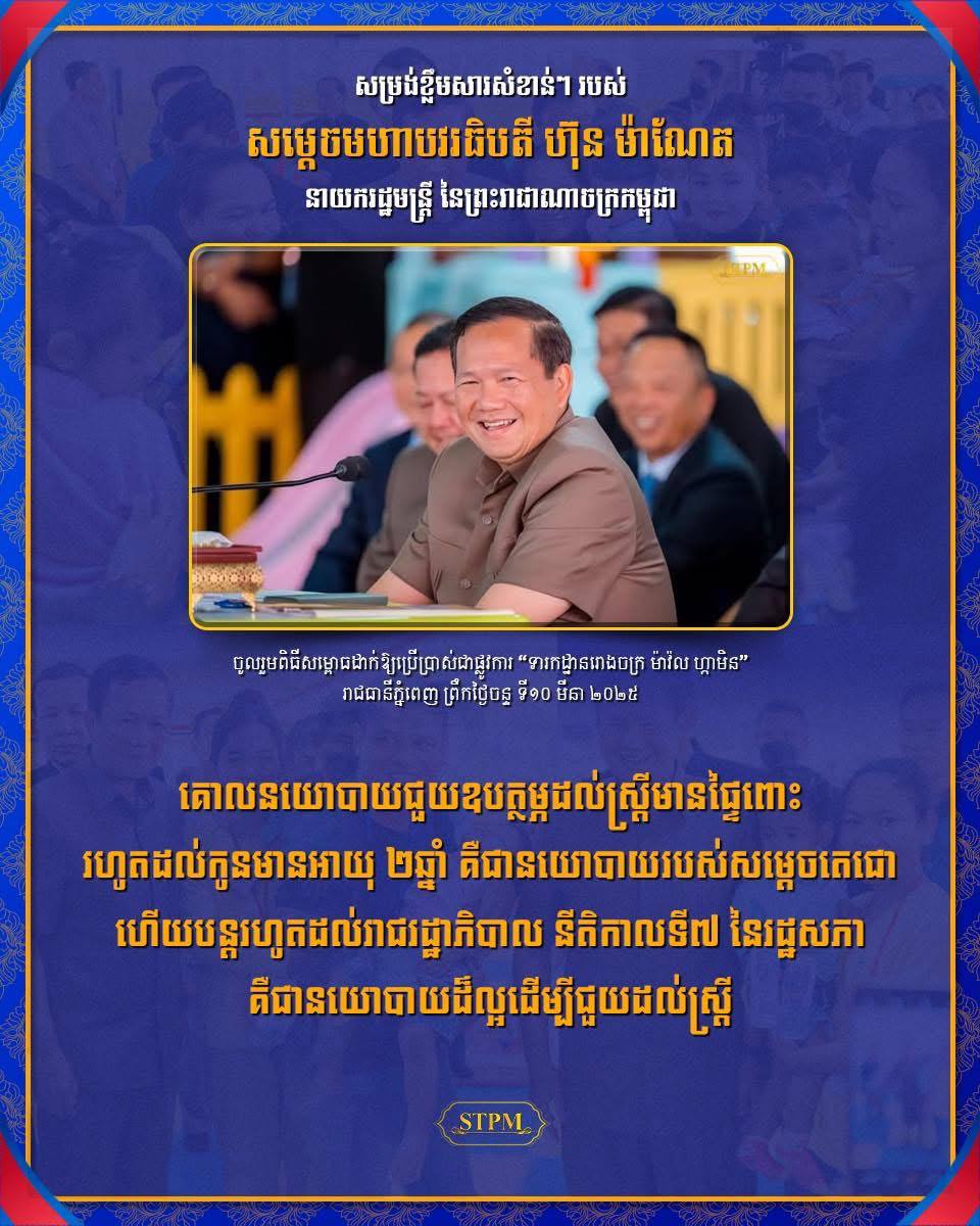 AKP ភ្នំពេញ ថ្ងៃទី១០ ខែមីនា ឆ្នាំ២០២៥– ក្នុងឱកាសសំណេះសំណាលជាមួយកម្មករនយោជិត និងសម្ពោធទារកដ្ឋាន នៅរោងចក្រម៉ាវ៉ល ហ្កាមិន នាព្រឹកថ្ងៃទី១០ ខែមីនា ឆ្នាំ២០២៥, សម្ដេចមហាបវរធិបតី ហ៊ុន ម៉ាណែត នាយករដ្ឋមន្ត្រី នៃព្រះរាជាណាចក្រកម្ពុជា បានមានប្រសាសន៍ថា គោលនយោបាយជួយឧបត្ថម្ភដល់ស្រ្តីមានផ្ទៃពោះ រហូតដល់កូនមានអាយុ...