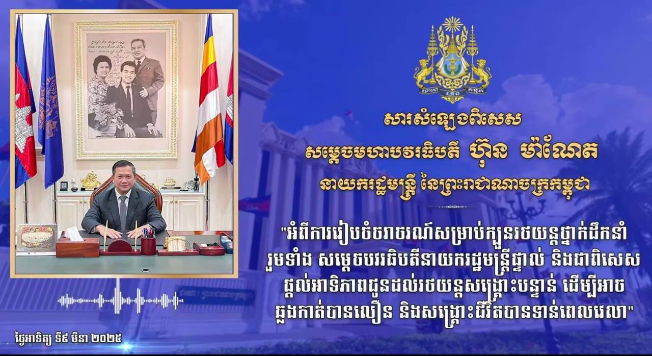 AKP ភ្នំពេញ ថ្ងៃទី០៩ ខែមីនា ឆ្នាំ២០២៥--សម្ដេចមហាបវរធិបតី ហ៊ុន ម៉ាណែត តាមរយៈសារជាសំណេរ អមដោយសំឡេង បង្ហោះតាមបណ្ដាញសង្គម នារសៀលថ្ងៃទី០៩ ខែមីនា ឆ្នាំ២០២៥នេះ បានស្នើឱ្យសមត្ថកិច្ចសម្រួលចរាចរណ៍ប្រកបដោយភាពបត់បែនទៅតាមករណីចាំបាច់នីមួយៗ ជាពិសេសករណីពាក់ព័ន្ធជាមួយរថយន្តសង្គ្រោះបន្ទាន់ ដើម្បីជួយសង្រ្គោះជីវិតអ្នកជ...
