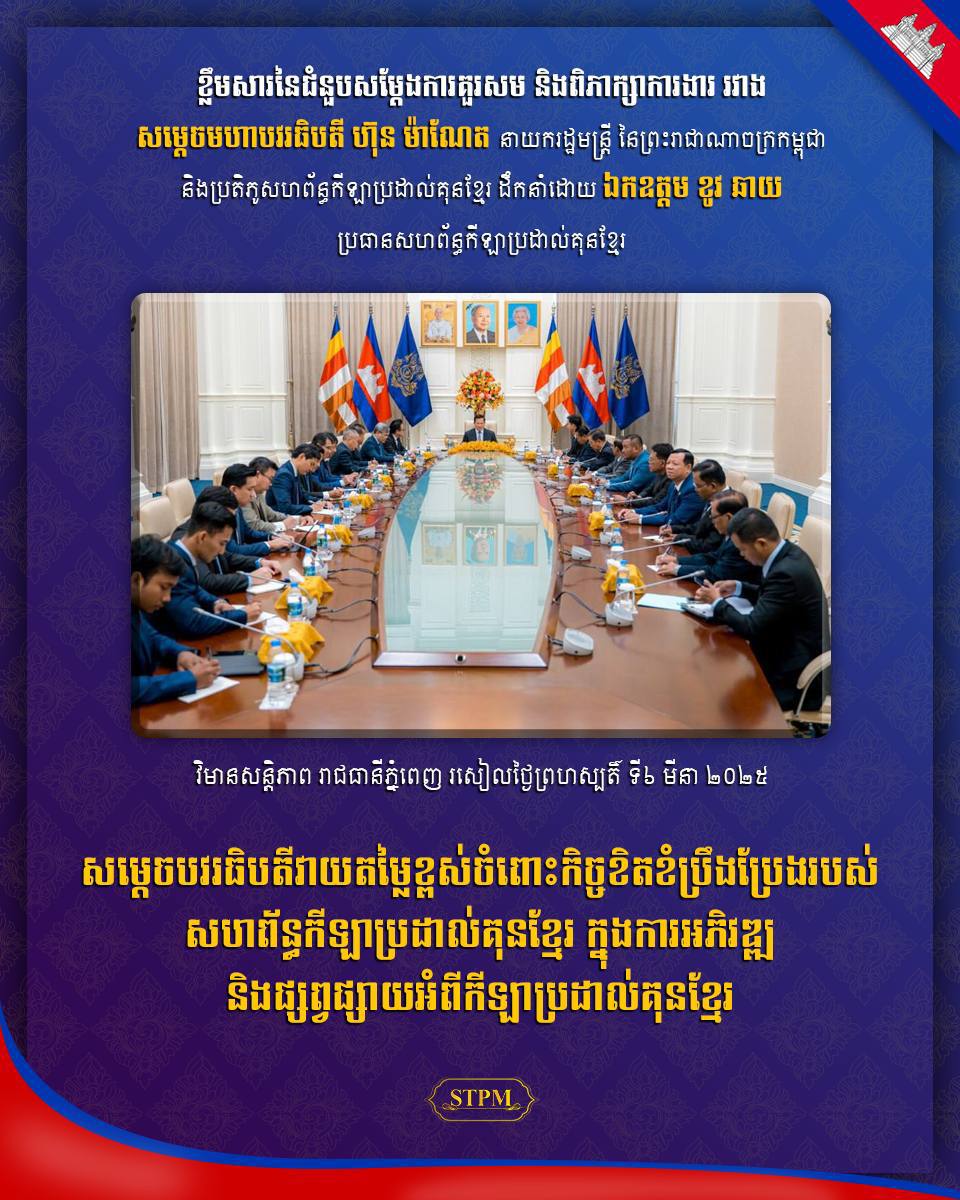 AKP ភ្នំពេញ ថ្ងៃទី០៦ ខែមីនា ឆ្នាំ២០២៥– សម្ដេចមហាបវរធិបតី ហ៊ុន ម៉ាណែត នាយករដ្ឋមន្ត្រីនៃព្រះរាជណាចក្រកម្ពុជា នារសៀលថ្ងៃទី០៦ ខែមីនា ឆ្នាំ២០២៥នេះ បានអនុញ្ញាតឱ្យ ឯកឧត្តម ខូវ ឆាយ ប្រធានសហព័ន្ធកីឡាប្រដាល់គុនខ្មែរ និងសហការីជាថ្នាក់ដឹកនាំសហព័ន្ធ ចូលជួបសម្តែងការគួរសម នៅវិមានសន្ដិភាព។ ក្នុងឱកាសនៃជំន...