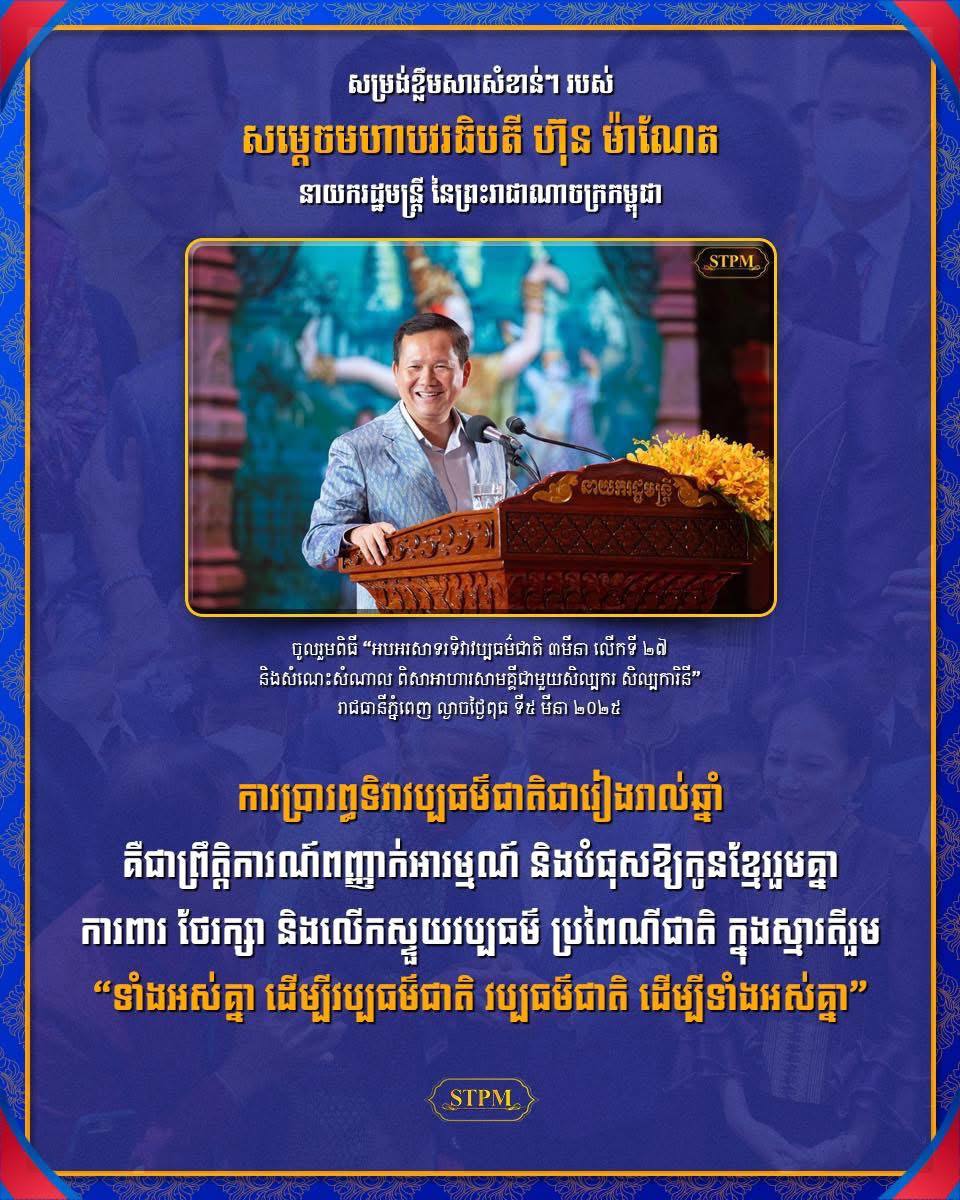 AKP ភ្នំពេញ ថ្ងៃទី០៥ ខែមីនា ឆ្នាំ២០២៥ – សម្ដេចមហាបវរធិបតី ហ៊ុន ម៉ាណែត នាយករដ្ឋមន្ត្រីនៃព្រះរាជាណាចក្រកម្ពុជា បានថ្លែងក្នុងឱកាសប្រារព្ធ«ទិវាវប្បធម៌ជាតិ ៣ មីនា លើកទី ២៧ ឆ្នាំ២០២៥» និង «ពិធីសំណេះសំណាលជាមួយសិល្បករ សិល្បការិនី ទូទាំងប្រទេសលើកទី ៦» នាល្ងាចថ្ងៃទី៥ ខែមីនា ឆ្នាំ២០២៥ ថា ការប្រារព្ធទិវាវប្បធម៌...