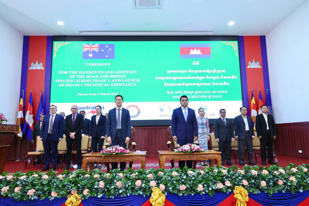AKP ភ្នំពេញ ថ្ងៃទី០៥ ខែមីនា ឆ្នាំ២០២៥ -- ឯកឧត្តម ប៉េង ពោធិ៍នា រដ្ឋមន្ត្រីក្រសួងសាធារណការ និងដឹកជញ្ជូន និង ឯកឧត្តម ដេរិក យីប (Derek YIP) ឯកអគ្គរដ្ឋទូតអូស្ត្រាលីប្រចាំកម្ពុជា បានអញ្ជើញជាអធិបតីក្នុងពិធីប្រគល់ទទួល និងប្រកាសឱ្យប្រើប្រាស់បទដ្ឋានបច្ចេកទេសសំណង់ផ្លូវ និងស្ពាន ជំហានទី១ និងប្រកាសជំនួយបច្ចេកទេស...