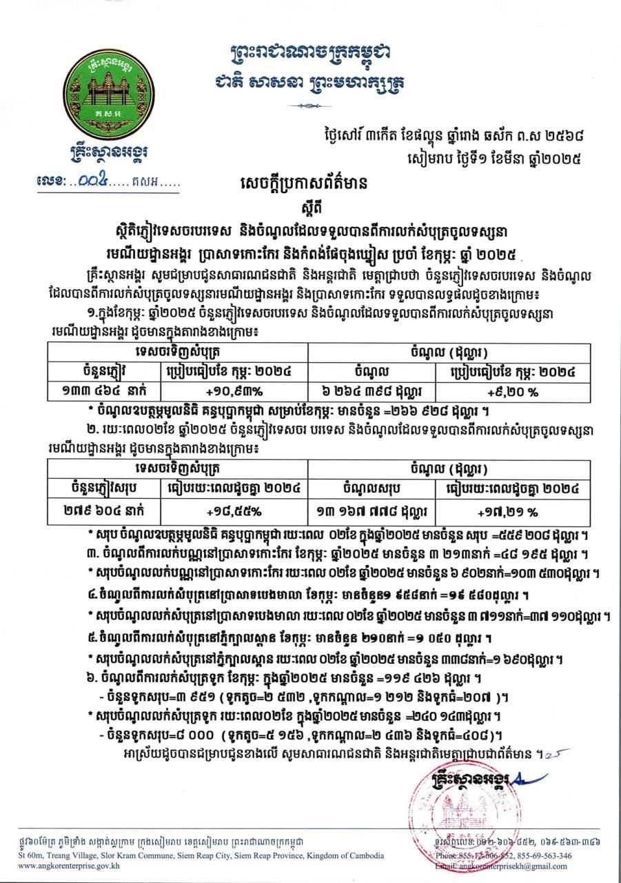 រយៈពេល២ខែដើមឆ្នាំ២០២៥ គ្រឹះស្ថានអង្គរទទួលបានប្រាក់ចំណូលចំនួន ១៣ ១៦៧ ៧៧៨ដុល្លារ ពីការលក់សំបុត្រជូនភ្ញៀវទេសចរបរទេស