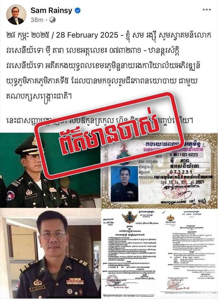 អ្នកនាំពាក្យអគ្គបញ្ជាការដ្ឋាន ៖ ករណីនាយទាហានឈ្មោះ ម៉ី តារា នេះ ជារឿងចាស់ទេ ប៉ុន្តែសម រង្ស៊ី បានយកមកបង្ហោះជាថ្មី ដើម្បីបំភាន់មតិសាធារណជន