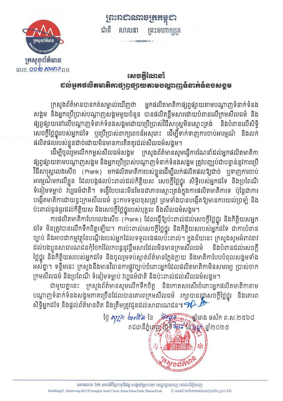 ក្រសួងព័ត៌មាន ចេញសេចក្តីណែនាំដល់អ្នកផលិតមាតិកាផ្សព្វផ្សាយតាមបណ្តាញទំនាក់ទំនងសង្គម