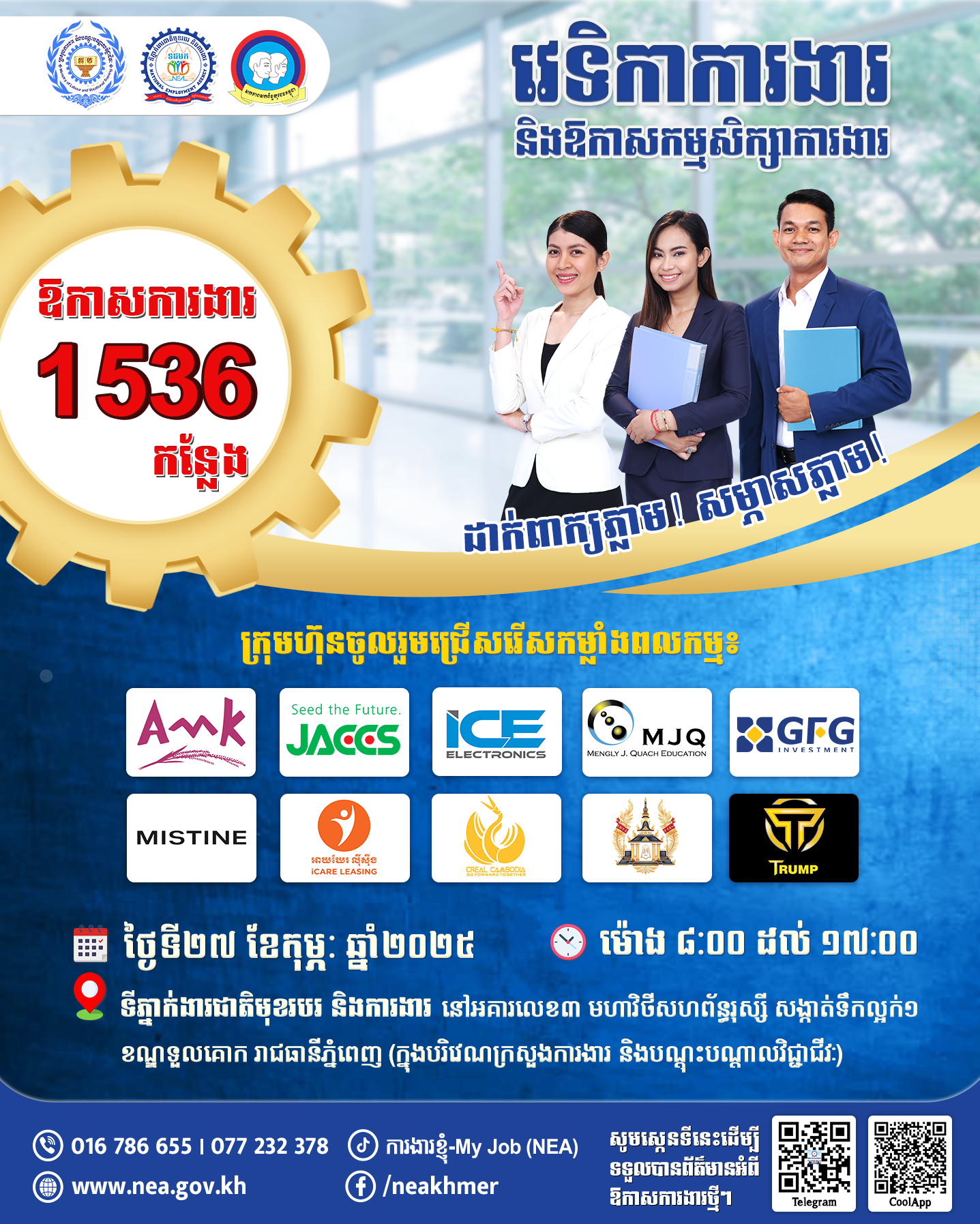 AKP ភ្នំពេញ ថ្ងៃទី២៥ ខែកុម្ភៈ ឆ្នាំ២០២៥-- ទីភ្នាក់ងារជាតិមុខរបរ និងការងារ (NEA) នៃក្រសួងការងារ និងបណ្តុះបណ្តាលវិជ្ជាជីវៈ សហការជាមួយសហភាពសហព័ន្ធយុវជនកម្ពុជាវិស័យការងារ សន្តិសុខសង្គម និងបណ្តុះបណ្តាលវិជ្ជាជីវៈ នឹងរៀបចំវេទិកាការងារ និងឱកាសកម្មសិក្សាការងារ នៅថ្ងៃព្រហស្បតិ៍ ទី២៧ ខែកុម្ភៈ ឆ្នាំ២០២៥ ខាងមុខន...