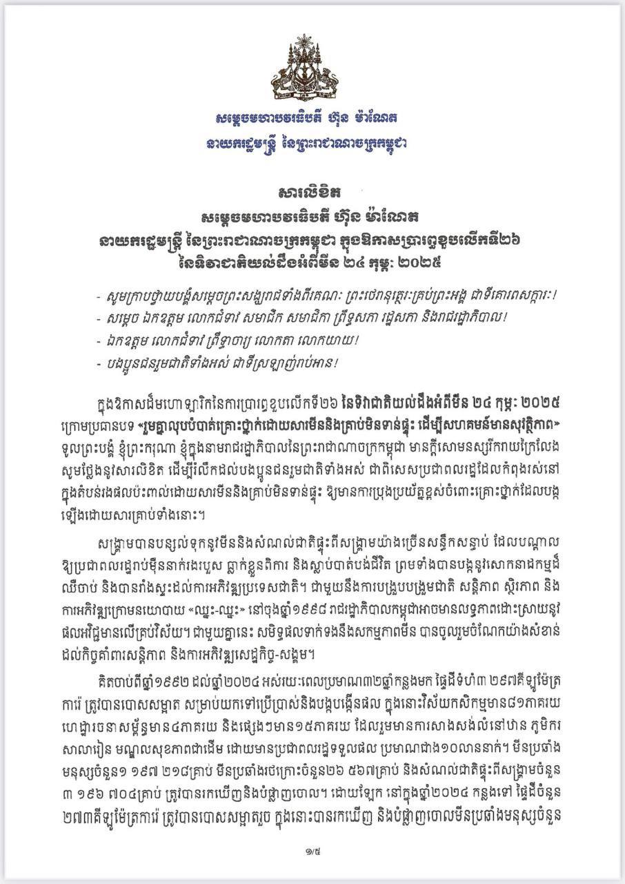 សារលិខិត របស់ សម្តេចធិបតី ក្នុងឱកាសខួបលើក២៦ នៃទិវាជាតិយល់ដឹងអំពីមីន (២៤ កុម្ភៈ ២០២៥)