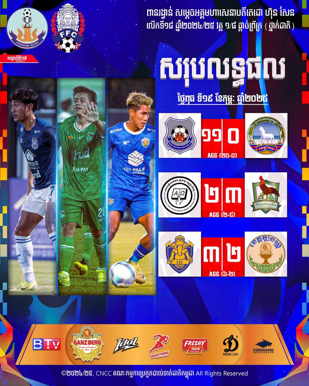 AKP ភ្នំពេញ ថ្ងៃទី២០ ខែកុម្ភៈ ឆ្នាំ២០២៥-- ការប្រកួតកីឡាបាល់ទាត់ ពានរង្វាន់សម្តេចតេជោ ហ៊ុន សែន លើកទី១៨ រដូវកាល ២០២៤-២០២៥ ថ្នាក់ជាតិបានរកឃើញបេក្ខភាព៣ក្រុមចុងក្រោយ គឺព្រះខ័នរាជស្វាយរៀង គិរីវង់សុខសែនជ័យ និងក្រុមអាយអេសអាយដង្កោសែនជ័យ ដែលបានឡើងវគ្គ៨ក្រុមចុងក្រោយ ឬវគ្គ១/៤ផ្តាច់ព្រ័ត្រ។ បេក្ខ...
