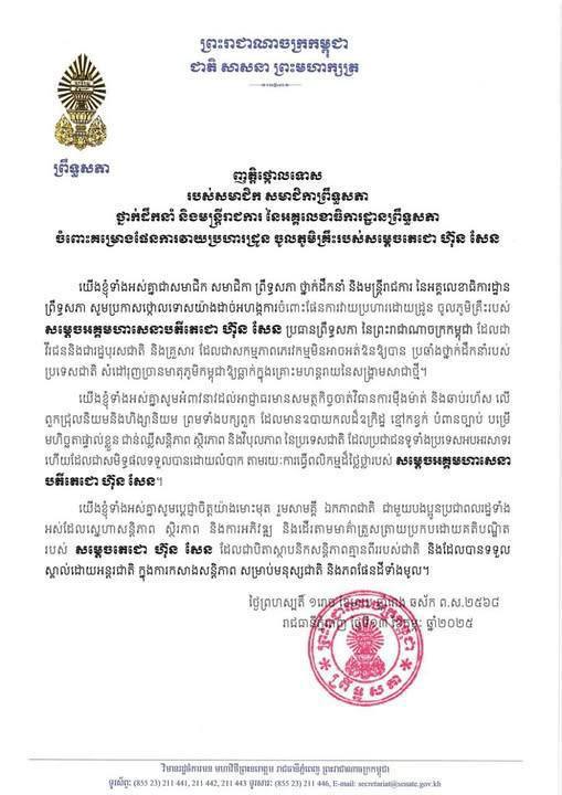 ញត្តិថ្កោលទោស របស់ក្រសួង ស្ថាប័ន សមាគម សហជីពនានា ចំពោះគម្រោងវាយប្រហារដោយដ្រូនចូលភូមិគ្រឹះ សម្តេចតេជោ ហ៊ុន សែន