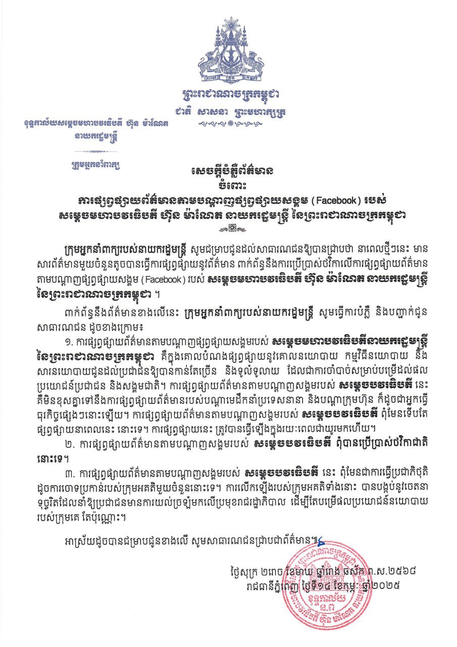 សេចក្តីបំភ្លឺព័ត៌មាន ចំពោះការផ្សព្វផ្សាយព័ត៌មានតាមបណ្តាញផ្សព្វផ្សាយសង្គម (Facebook) របស់ សម្តេចធិបតី នាយករដ្ឋមន្ត្រី