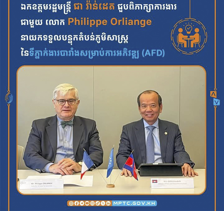 AKP ភ្នំពេញ ថ្ងៃទី១៣ ខែកុម្ភៈ ឆ្នាំ២០២៥ -- ឯកឧត្ដម ជា វ៉ាន់ដេត រដ្ឋមន្ត្រីក្រសួងប្រៃសណីយ៍ និងទូរគមនាគមន៍ (ក.ប.ទ.) កាលពីថ្ងៃទី១២ ខែកុម្ភៈ ឆ្នាំ២០២៥ បានជួបពិភាក្សាការងារជាមួយ លោក Philippe Orliange នាយកទទួលបន្ទុកតំបន់ភូមិសាស្ត្រនៃទីភ្នាក់ងារបារាំងសម្រាប់ការអភិវឌ្ឍ (AFD) នៅទីស្នាក់ការកណ្ដាល AFD។...