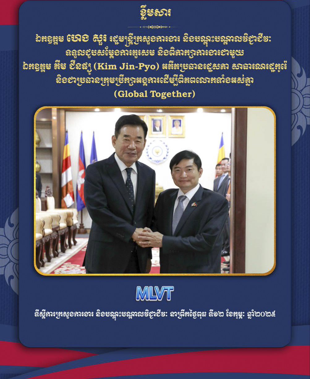 AKP ភ្នំពេញ ថ្ងៃទី១៣ ខែកុម្ភៈ ឆ្នាំ២០២៥ -- នៅក្នុងជំនួបសម្តែងការគួរសម និងពិភាក្សាការងារ រវាងឯកឧត្តម ហេង សួរ រដ្ឋមន្ត្រីក្រសួងការងារ និងបណ្តុះបណ្តាលវិជ្ជាជីវៈ ជាមួយឯកឧត្តម គីម ជីនផ្យូ (Kim Jin-Pyo) អតីតប្រធានរដ្ឋសភា សាធារណរដ្ឋកូរ៉េ និងជាប្រធានក្រុមប្រឹក្សាអង្គការដើម្បីពិភពលោកទាំងអស់គ្នា(Global Togeth...