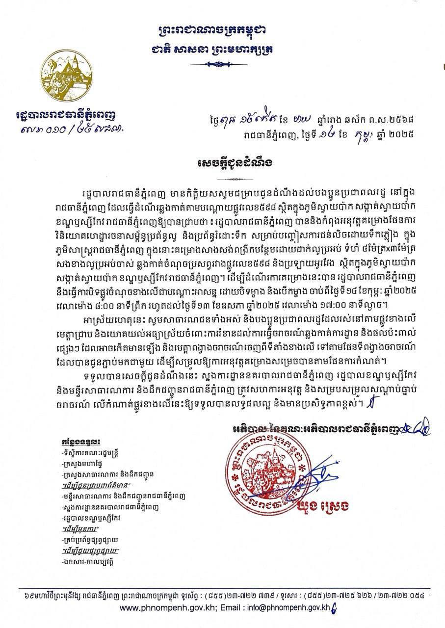 AKP ភ្នំពេញ ថ្ងៃទី១២ ខែកុម្ភៈ ឆ្នាំ២០២៥-- រដ្ឋបាលរាជធានីភ្នំពេញបានជូនដំណឹងដល់បងប្អូនប្រជាពលរដ្ឋនៅក្នុងរាជធានីភ្នំពេញ ដែលធ្វើដំណើរឆ្លងកាត់តាមបណ្តោយផ្លូវលេខ៥៩៨ ស្ថិតក្នុងភូមិស្វាយប៉ាក សង្កាត់ស្វាយប៉ាក ខណ្ឌឫស្សីកែវ រាជធា នីភ្នំពេញ ថា រដ្ឋបាលរាជធានីភ្នំពេញ បាន និងកំពុងអនុវត្តគម្រោងផែនការ វិនិយោគហេដ្ឋារច...