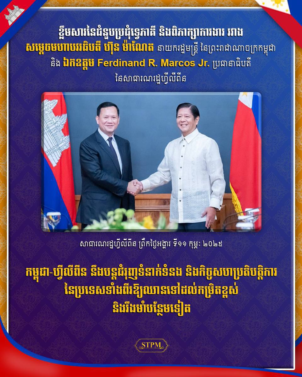 AKP ភ្នំពេញ ថ្ងៃទី១១ ខែកុម្ភៈ ឆ្នាំ២០២៥ -- សម្តេចមហាបវរធិបតី ហ៊ុន ម៉ាណែត នាយករដ្ឋមន្រ្តី នៃព្រះរាជាណាចក្រកម្ពុជា នាព្រឹកថ្ងៃទី១១ ខែកុម្ភៈ ឆ្នាំ២០២៥នេះ បានជួបពិភាក្សាការងារទ្វេភាគី ជាមួយឯកឧត្តម ហ្វឺឌីណាន់ ម៉ាកូស ជេអ (Ferdinand R. Marcos Jr.) ប្រធានាធិបតី នៃសាធារណរដ្ឋហ្វីលីពីន នៅក្នុងឱកាសនៃដំណើរទស្សន...