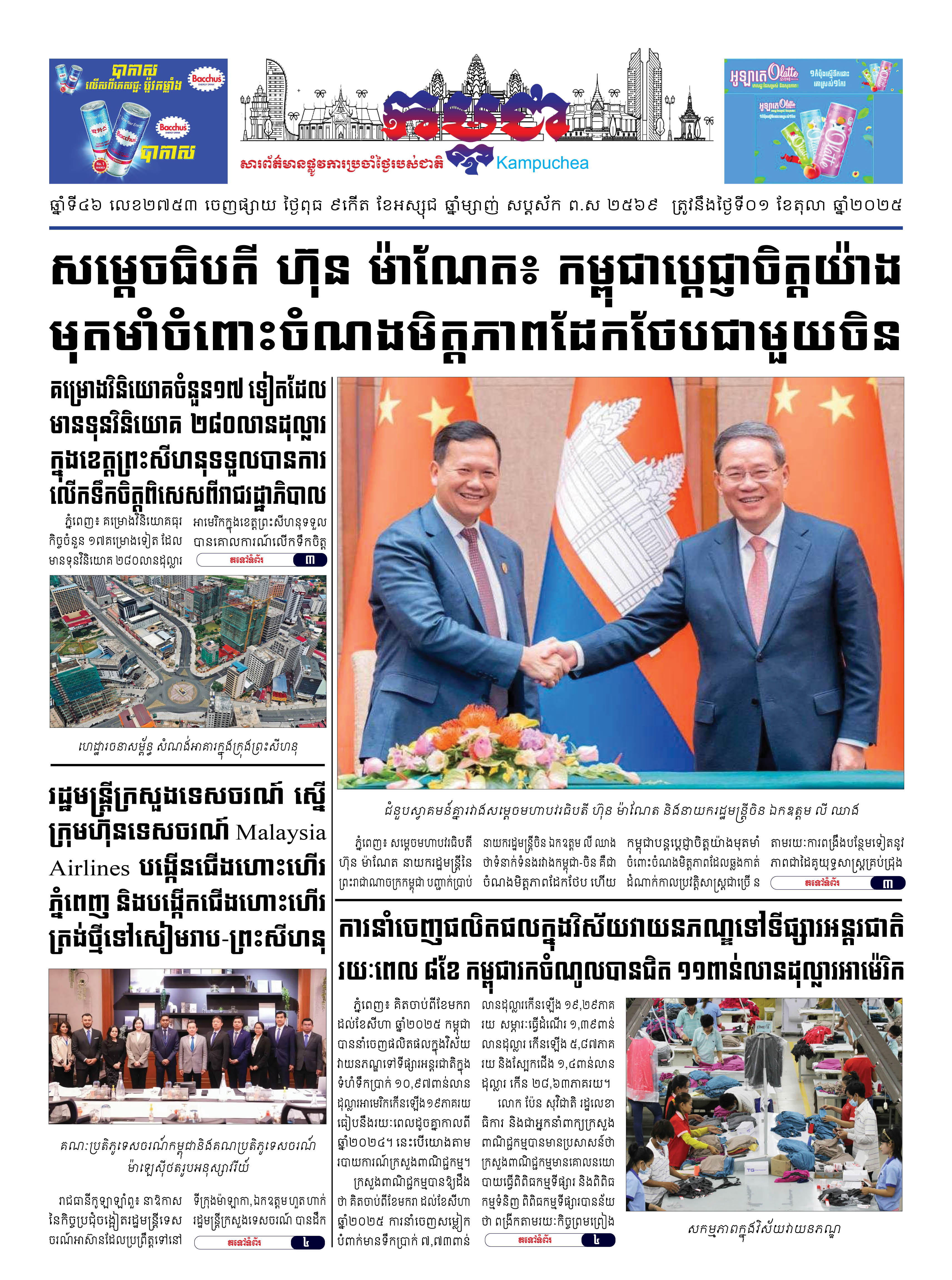 កាសែតកម្ពុជាលេខ២៧៥៣ ចេញផ្សាយថ្ងៃពុធ ទី០១ ខែតុលាឆ្នាំ២០២៥