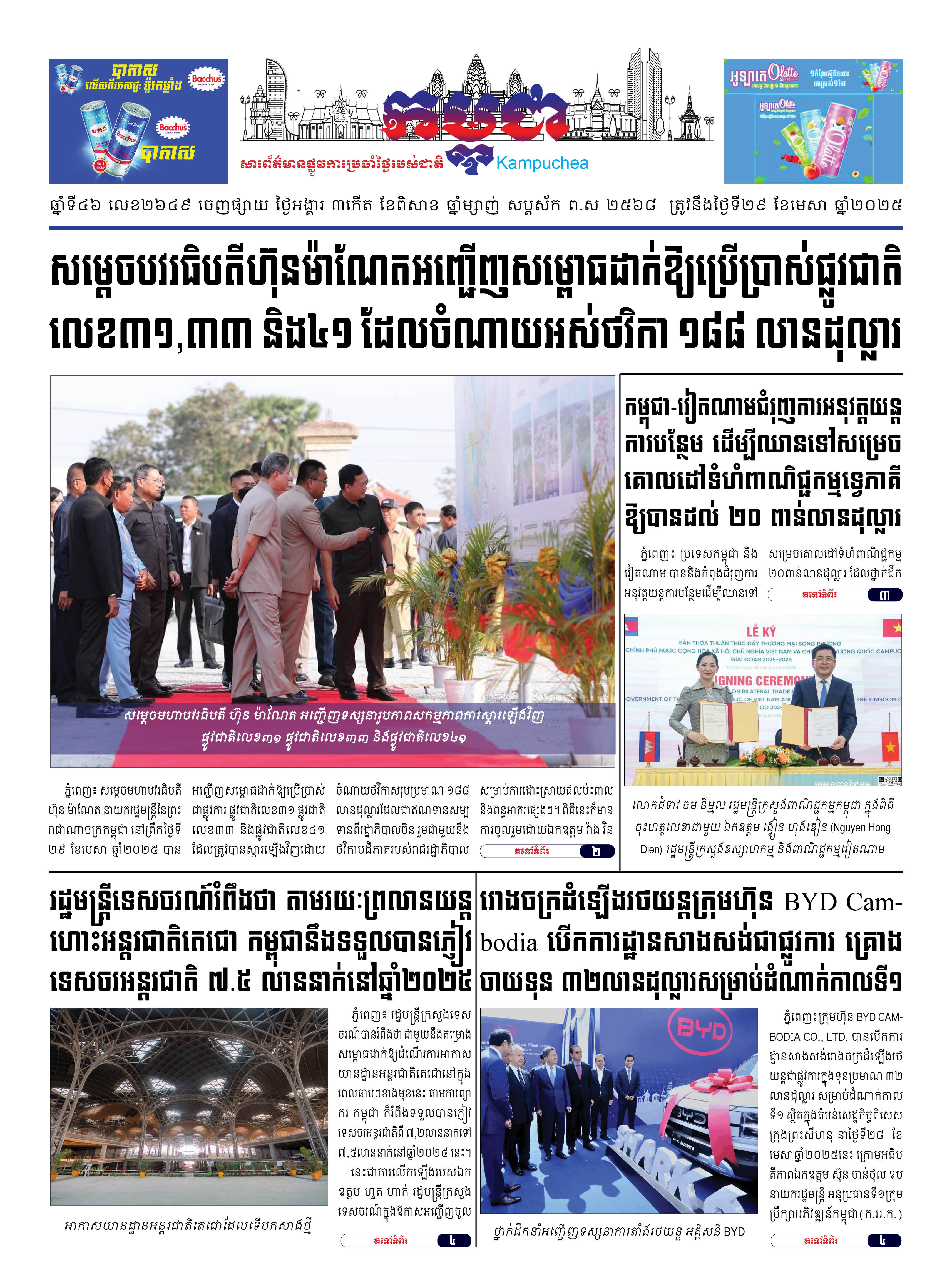 កាសែតកម្ពុជាលេខ២៦៥២ ចេញផ្សាយថ្ងៃចន្ទ ទី០៥ ខែឧសភា ឆ្នាំ២០២៥