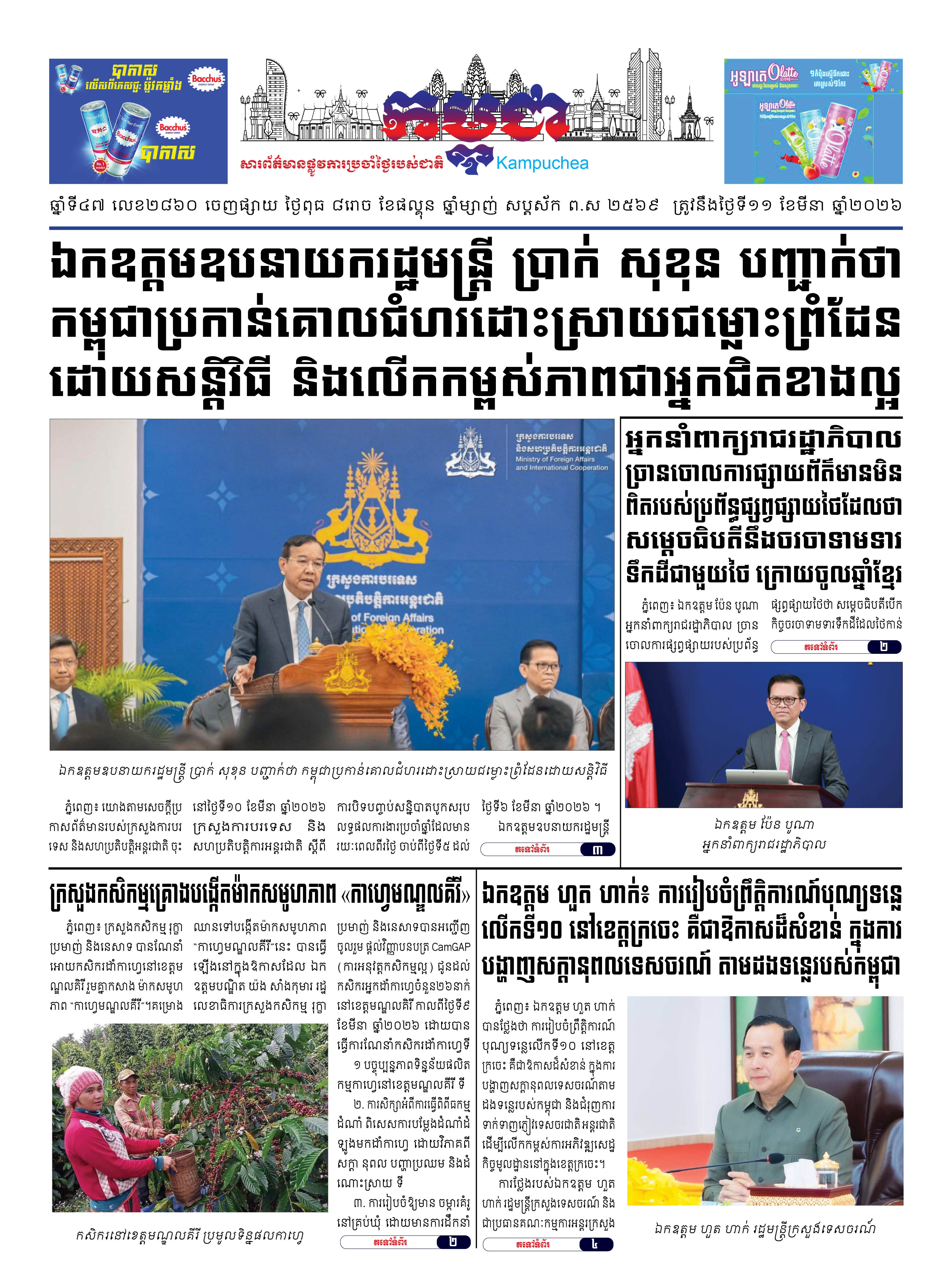 កាសែតកម្ពុជាលេខ២៨៦០ ចេញផ្សាយថ្ងៃពុធ ទី១១ ខែមីនា ឆ្នាំ២០២៦