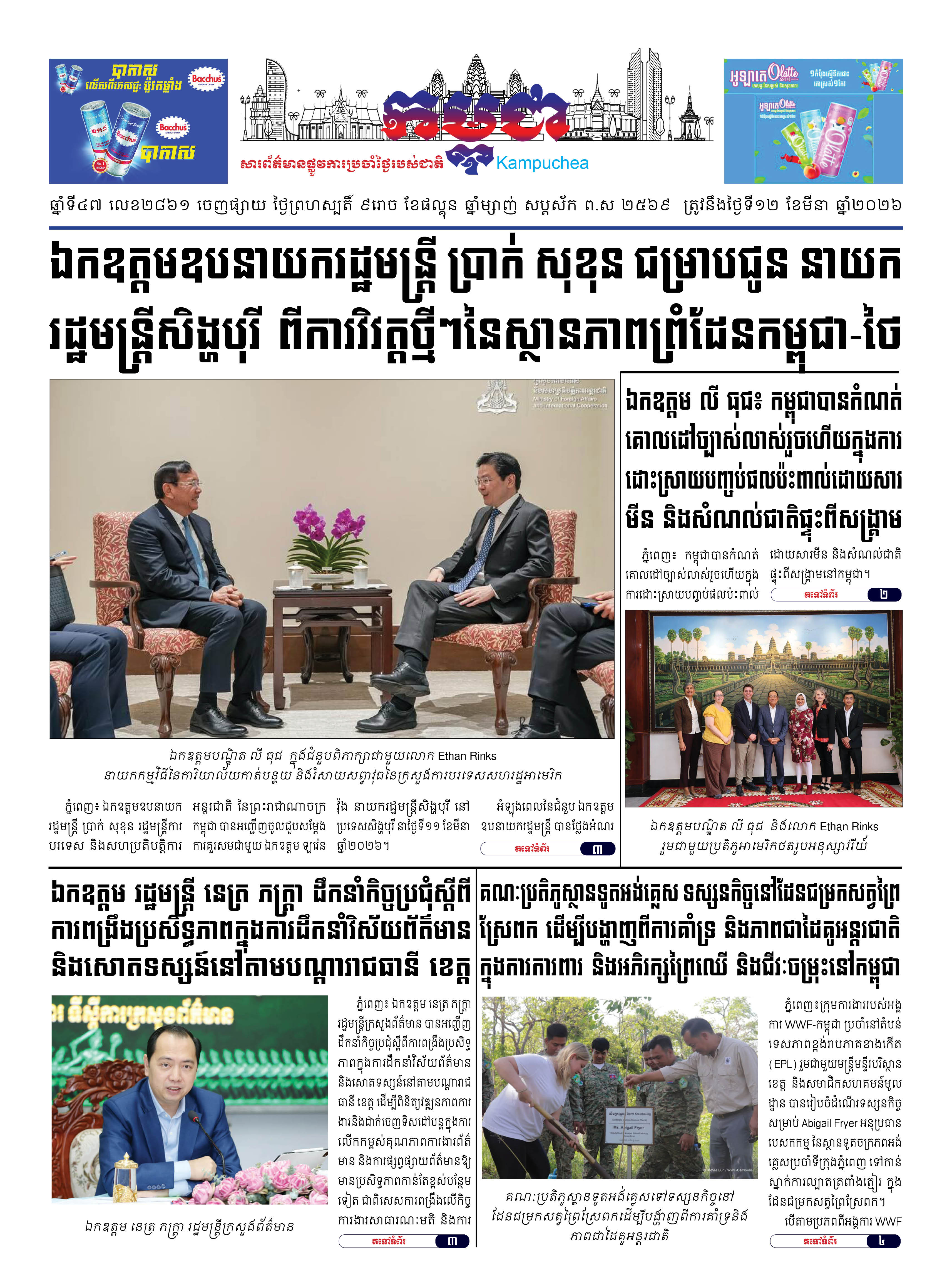 កាសែតកម្ពុជាលេខ២៨៦១ ចេញផ្សាយថ្ងៃព្រហស្បតិ៍ ទី១២ ខែមីនា ឆ្នាំ២០២៦