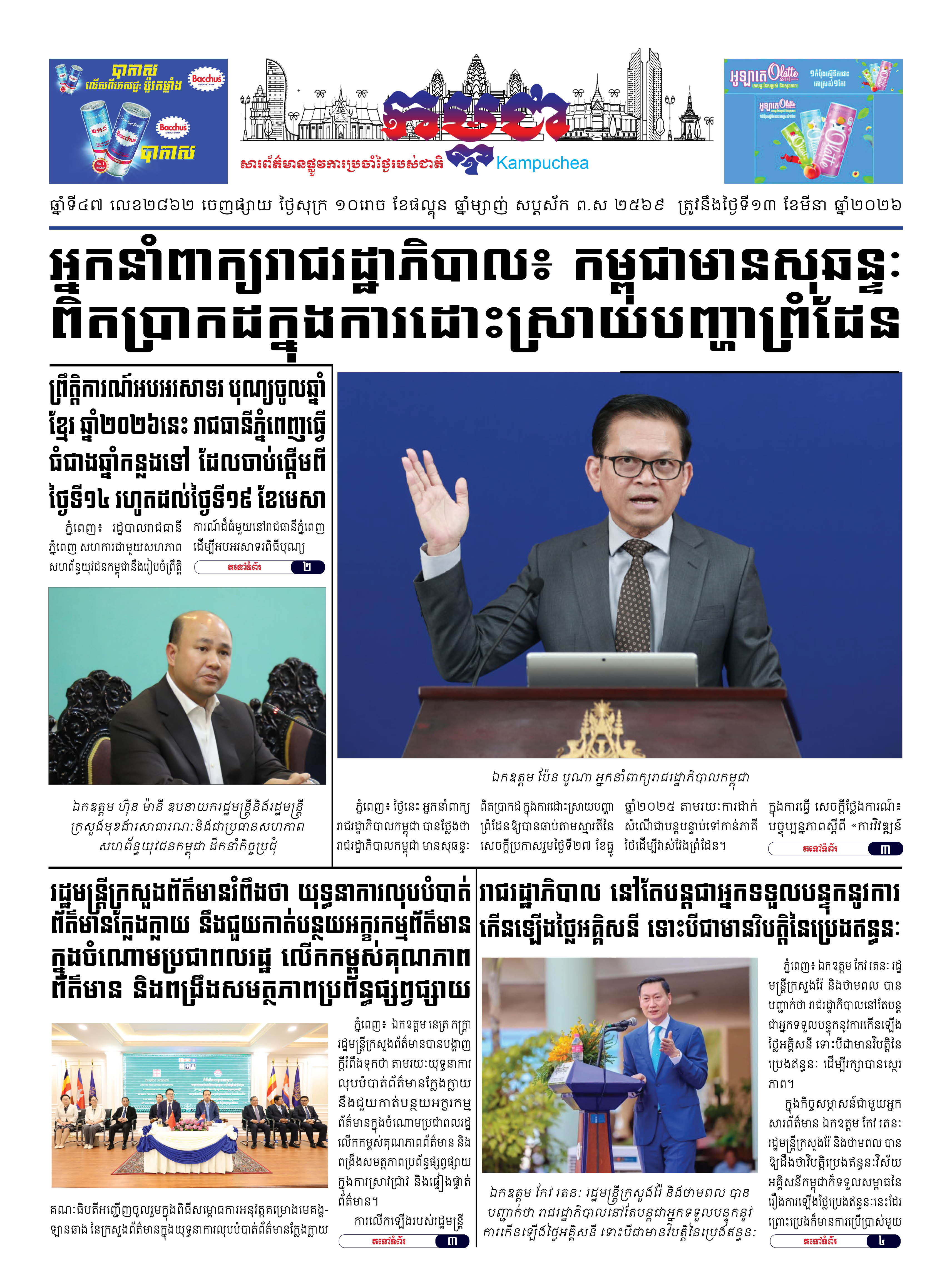 កាសែតកម្ពុជាលេខ២៨៦២ ចេញផ្សាយថ្ងៃសុក្រ ទី១៣ ខែមីនា ឆ្នាំ២០២៦