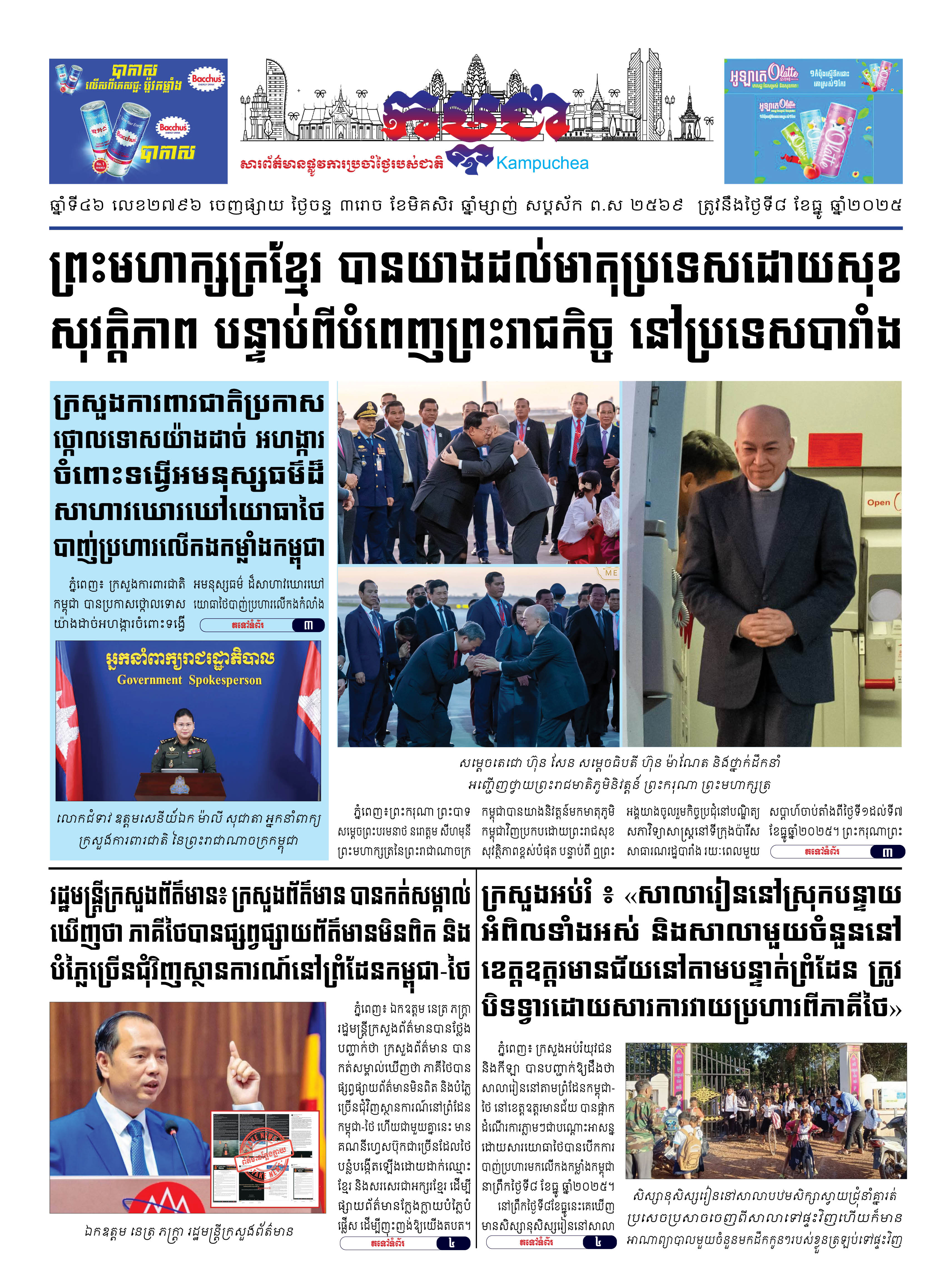 កាសែតកម្ពុជាលេខ២៧៩៦ ចេញផ្សាយថ្ងៃចន្ទ ទី០៨ ខែធ្នូ ឆ្នាំ២០២៥