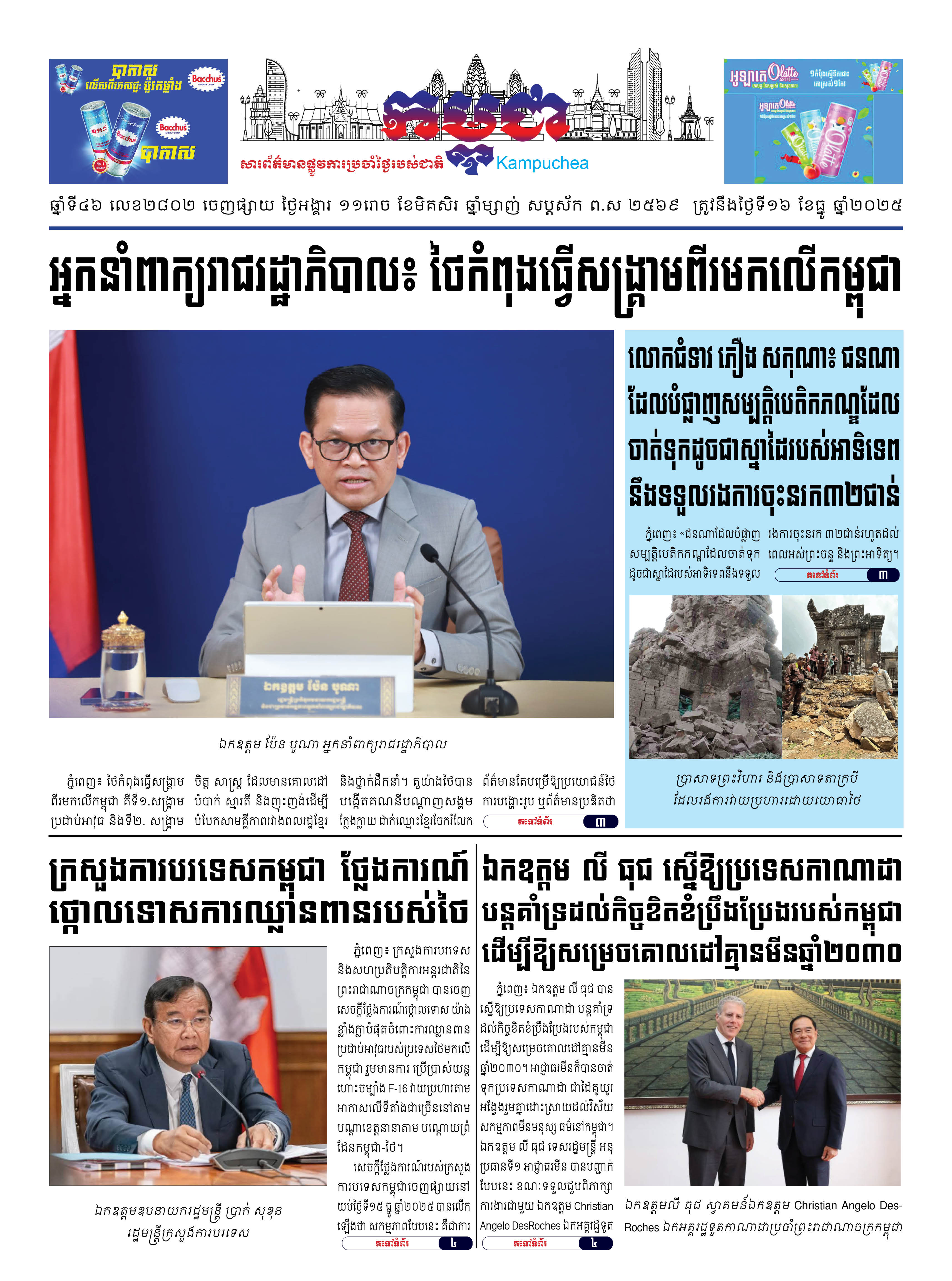 កាសែតកម្ពុជាលេខ២៨០២ ចេញផ្សាយថ្ងៃអង្គារ ទី១៦ ខែធ្នូ ឆ្នាំ២០២៥