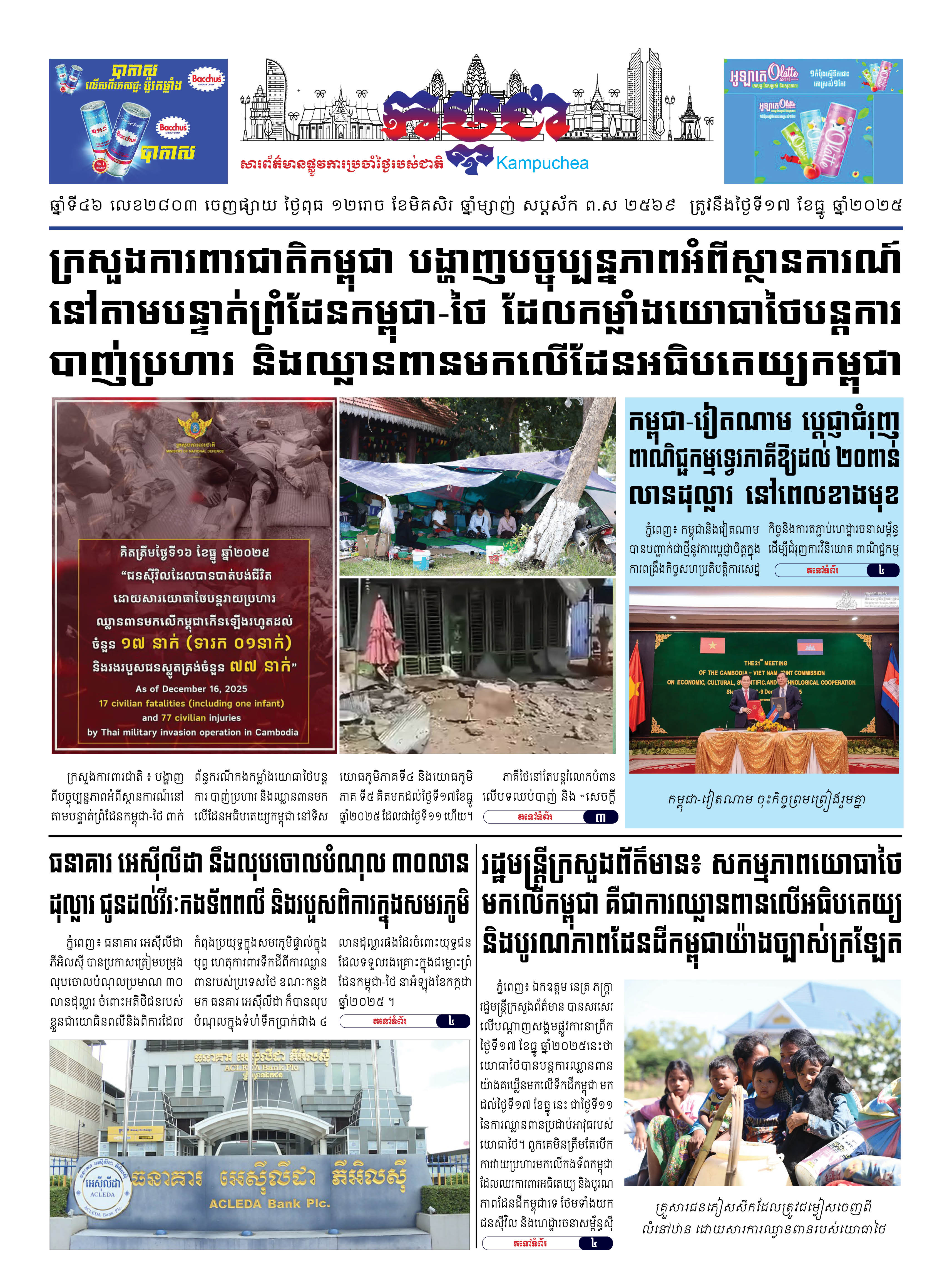 កាសែតកម្ពុជាលេខ២៨០៣ ចេញផ្សាយថ្ងៃពុធ ទី១៧ ខែធ្នូ ឆ្នាំ២០២៥