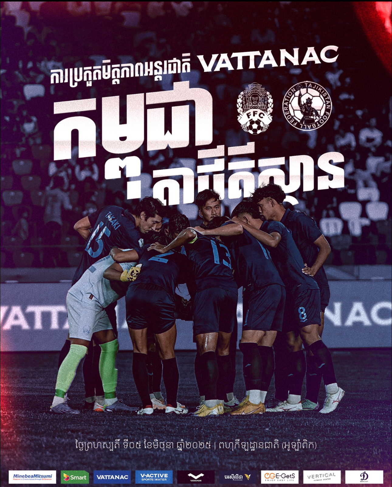 AKP ភ្នំពេញ ថ្ងៃទី២៤ ខែមេសា ឆ្នាំ២០២៥--សហព័ន្ធកីឡាបាល់ទាត់កម្ពុជា (FFC) បានប្រកាសនៅព្រឹកថ្ងៃទី២៤ ខែមេសានេះថា ក្រុមជម្រើសជាតិកម្ពុជានឹងត្រូវប្រកួតជាមួយក្រុមជម្រើសជាតិតាហ្ស៊ីគីស្ថាន (Tajikistan) ក្នុងជំនួបមិត្តភាពអន្តរជាតិ វឌ្ឍនៈ (Vattanac International Friendly) ដែលនឹងប្រព្រឹត្តទៅនៅថ្ងៃព្រហស្បតិ៍ ទី០...